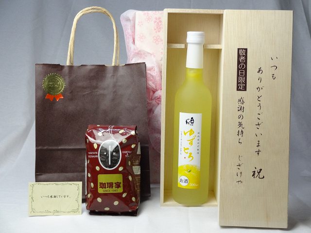 贈り物セット リキュールセット いつもありがとうございます感謝の気持ち木箱セット(とろり果汁・果肉とお米のうまみが見事にコラボした ゆずとろ500ml+オススメ珈琲豆(特注ブレンド200g)) メッセージカード付き