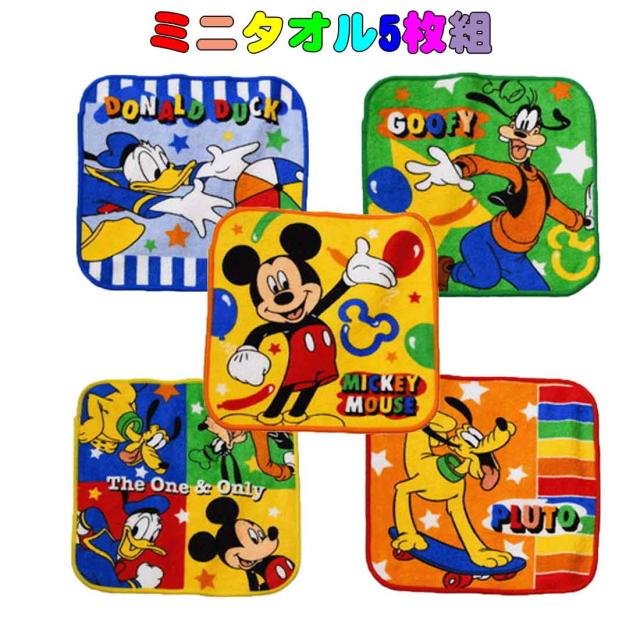 ミニタオル5枚組 ディズニー カラフルパーティー柄 15x15 綿100%ハンカチ ハンドタオル 保育園 幼稚園 小学校 子供 キッズ 遠足
