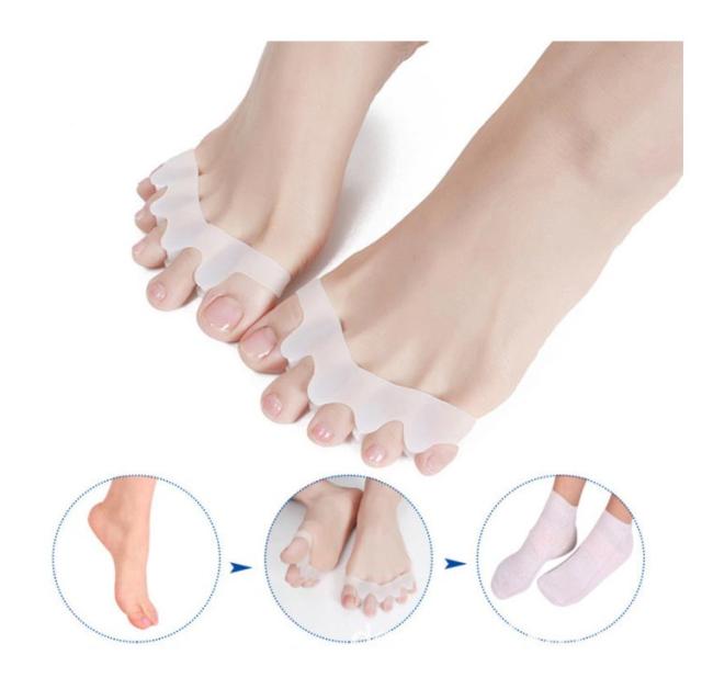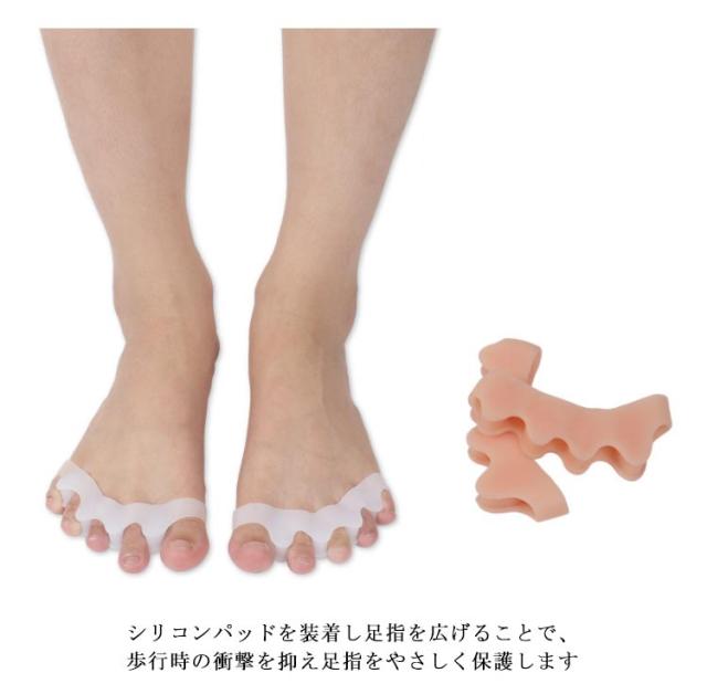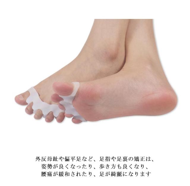 | 弾力性に優れたシリコン素材を使用 シリコンパッドを装着し足指を広げることで、歩行時の衝撃を抑え足指をやさしく保護します 外反母趾や偏平足など、足指や足裏の矯正は、姿勢が良くなったり、歩き方も良くなり、腰痛が緩和されたり、足が綺麗になります | |