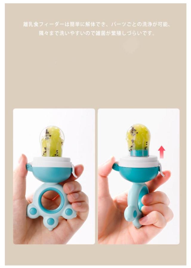 | 離乳食期にお使い頂けるおしゃぶりです。 人間工学に基づいたデザインで赤ちゃんの小さな手に持ちやすい。 サックは食品グレードのシリコン素材。カミカミすることであごの運動を増やし、『吸う』から『噛む」へのステップアップを支えます。お手入れも簡単です。 おでかけにもぴったり。小さなキャップはトレーニングカップとしても使えます。お薬を飲ませる時にも便利です。 赤ちゃんの手では外れないスナップロック。中身が漏れない安心設計♪ 離乳食フィーダーは簡単に解体でき、パーツごとの洗浄が可能、隅々まで洗いやすいので雑菌が繁殖しづらいです。 使用前に、哺乳瓶と同じような方法で消毒、或いはお湯で5〜8分間消毒する。 | |