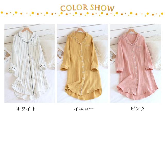 2重ガーゼ パジャマ ワンピース 長袖 コットン ルームワンピース 前開き ロングシャツ 部屋着 マタニティ ネグリジェ 送料無料 Wガーゼ ストライプ柄 春・夏・秋・冬 授乳服 妊婦服 ルームウェア ナイトウェア 寝巻き 入院