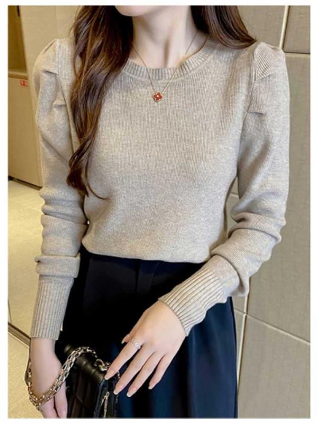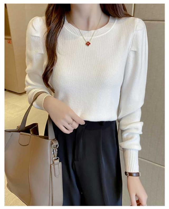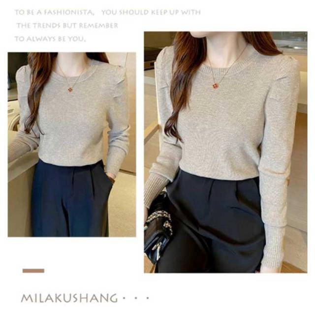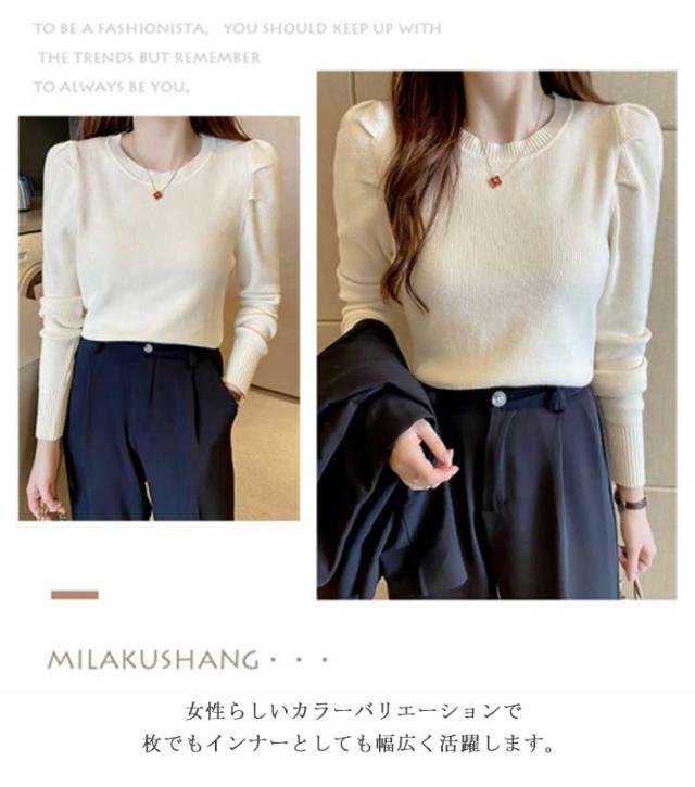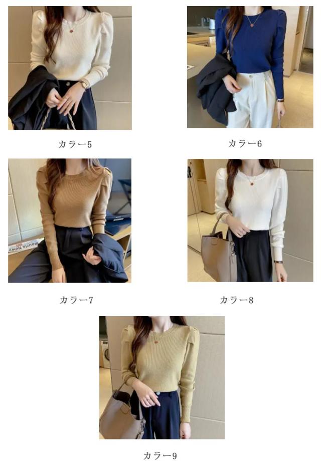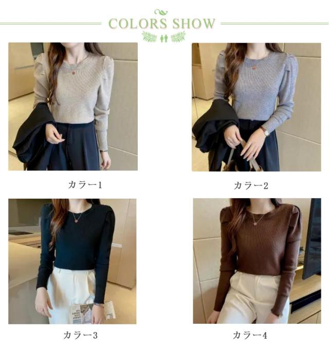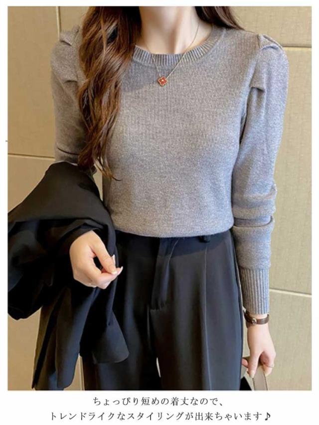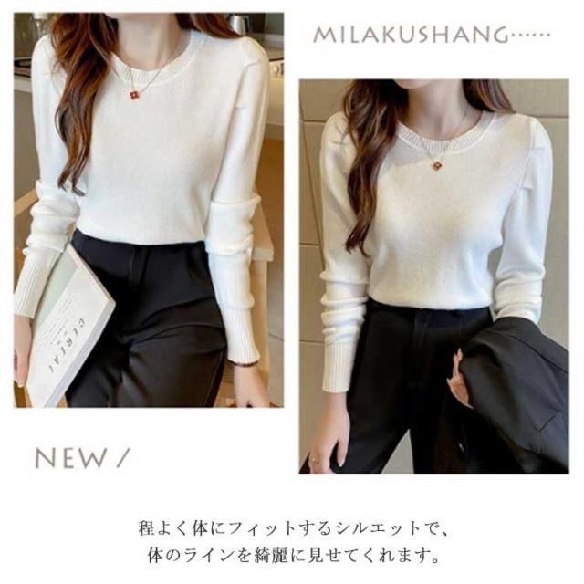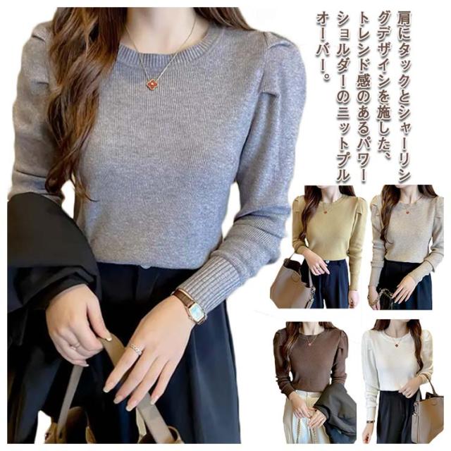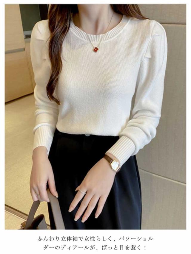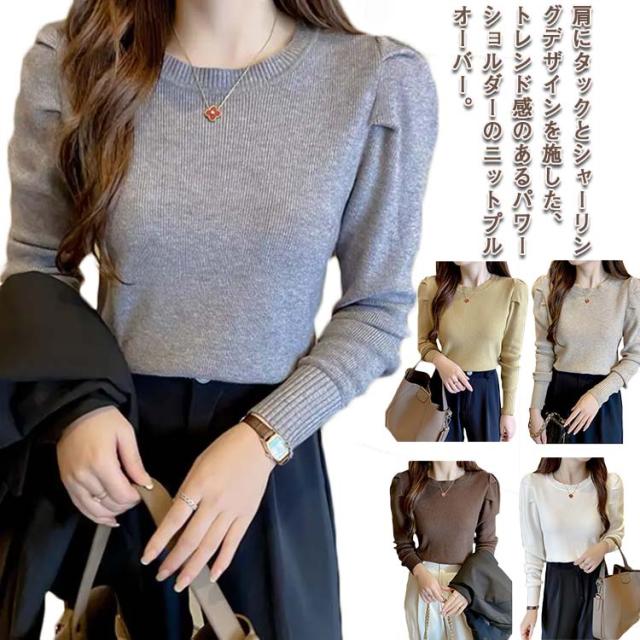 送料無料 ニット パワショル セーター パワショルニット トップス レディース パワーショルダー 長袖 無地 ラウンドネック ギャザーショルダー ボリューム 長袖 カットソー シンプル おしゃれ きれいめ カジュアル 着回し デイリー
