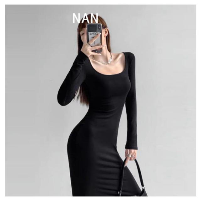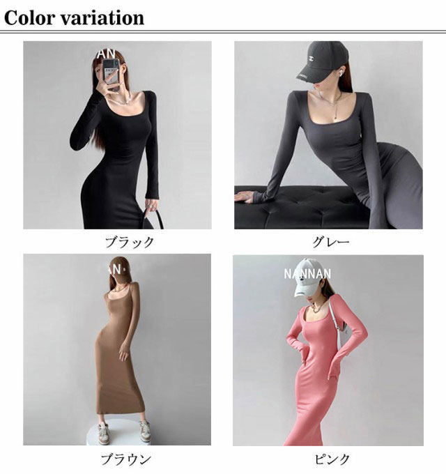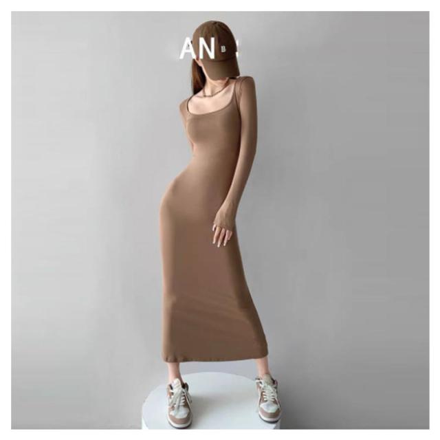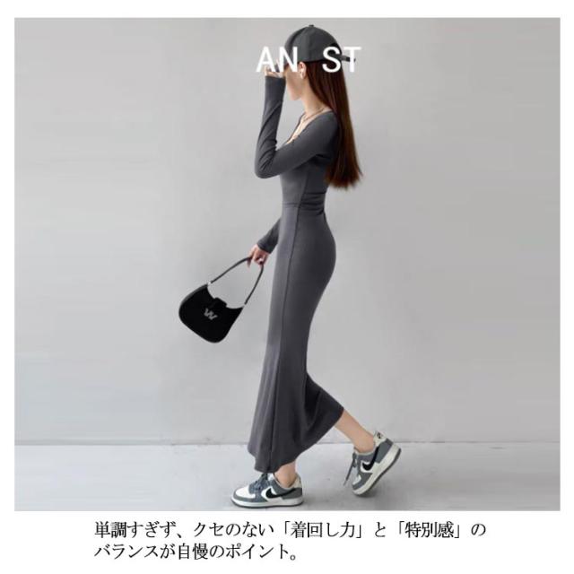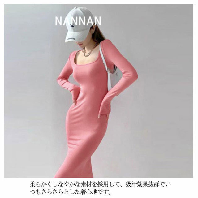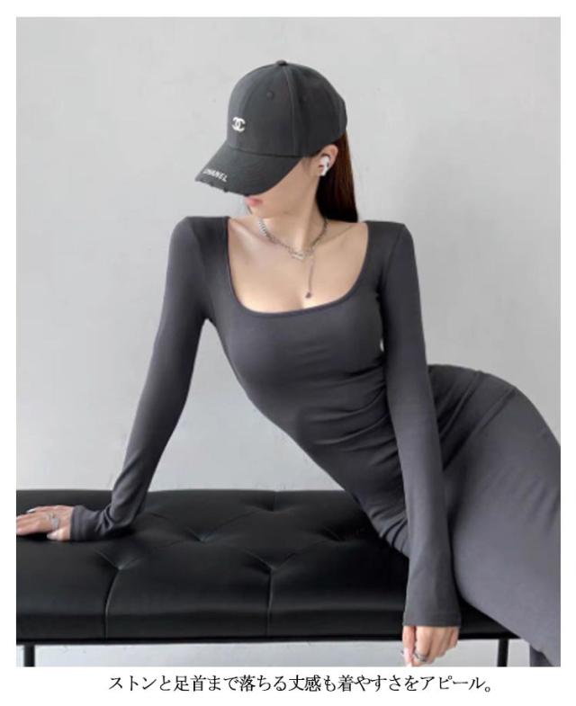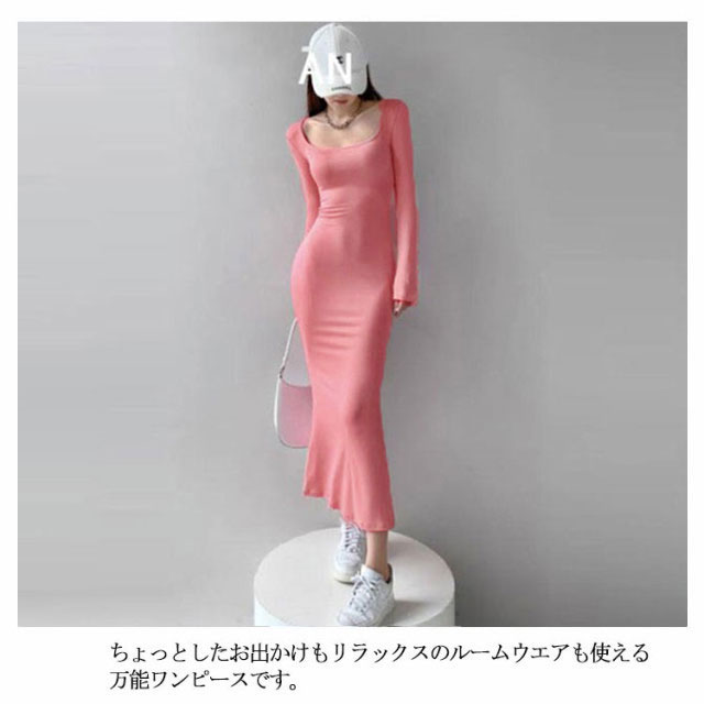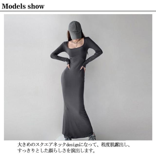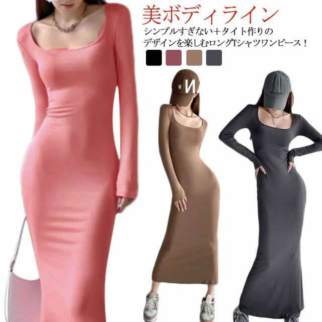 スクエアネックワンピース ロング丈 タイトワンピース マキシワンピース マキシ丈 tシャツワンピース スクエアネック ワンピース タイト フィット 長袖 マキシワンピ 美ボディライン 無地 送料無料