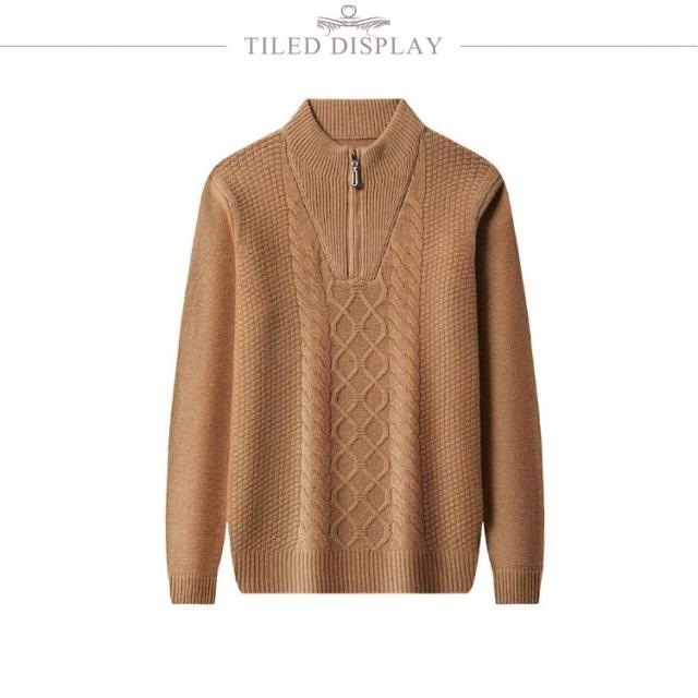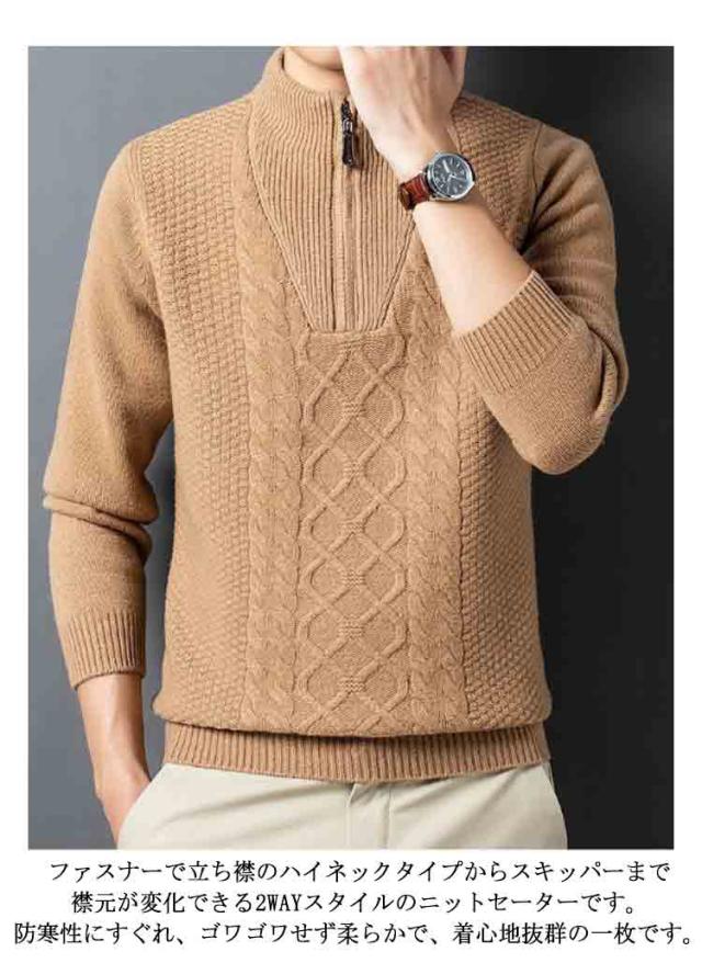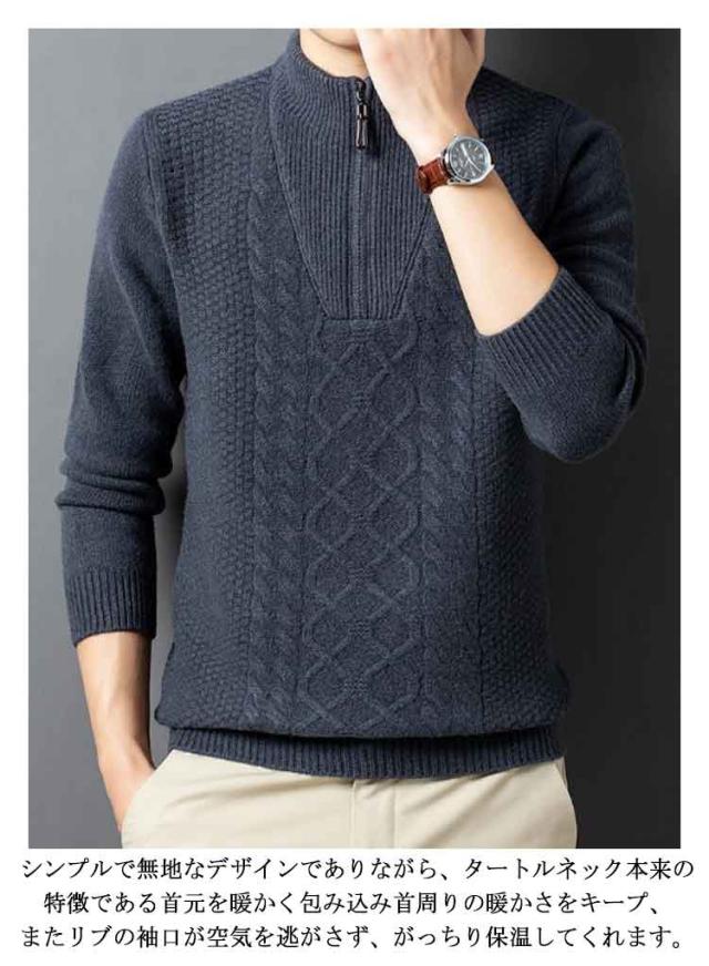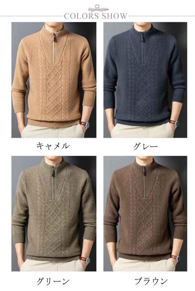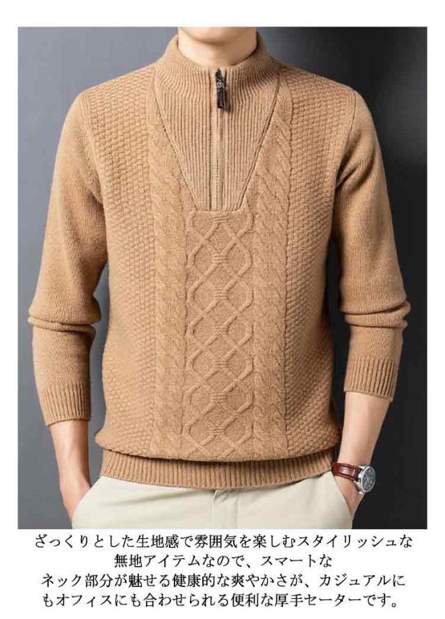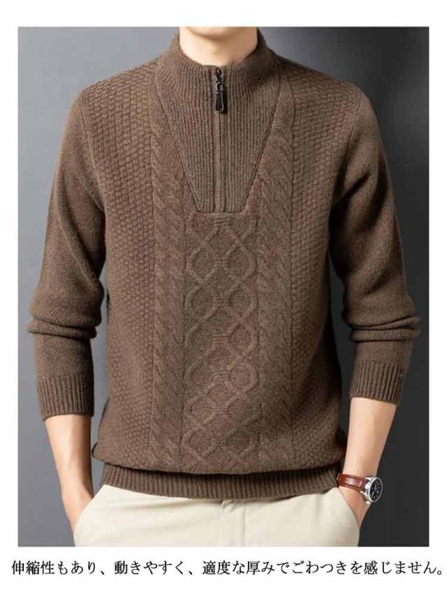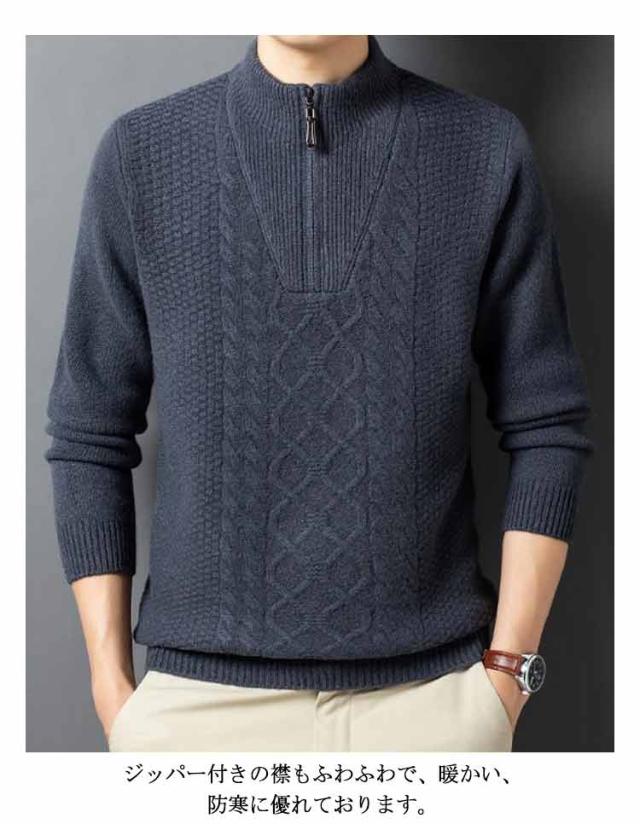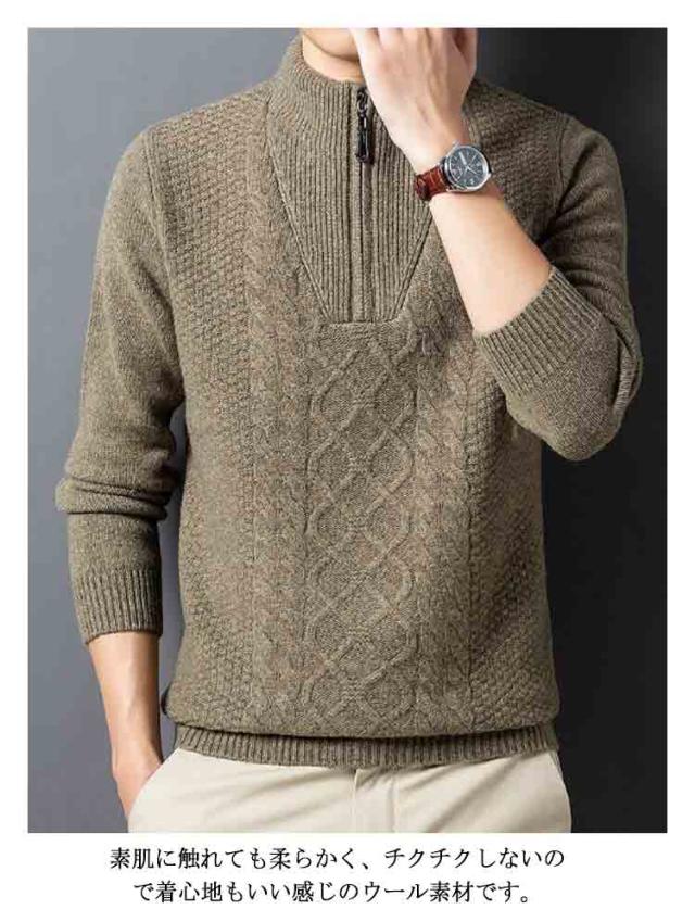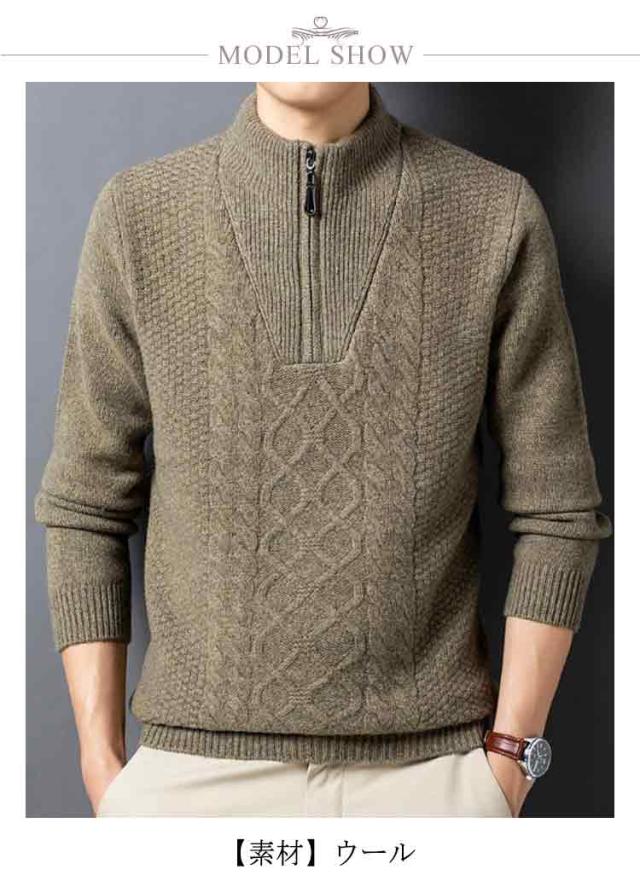ニット セーター メンズ ウール100% ハーフジップ ケーブル編み ウールセーター 立襟 長袖 ゴルフウェア ハイネック プルオーバー メンズセーター カジュアル トップス 秋冬 暖かい メンズ ニット 厚手 おしゃれ メンズファッション 父の日 春秋