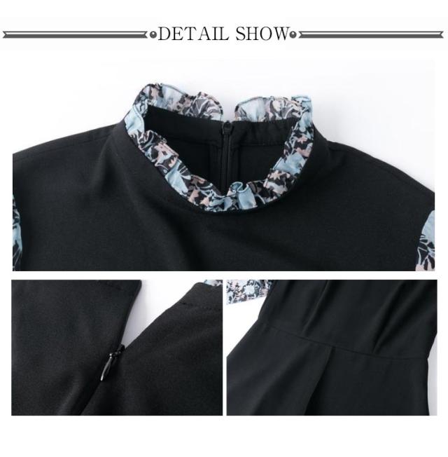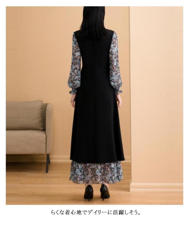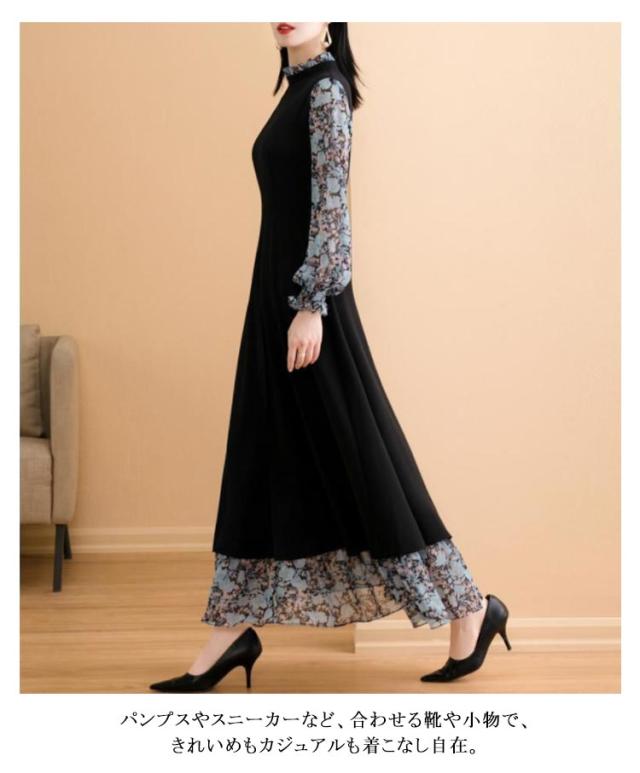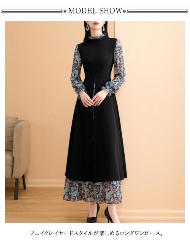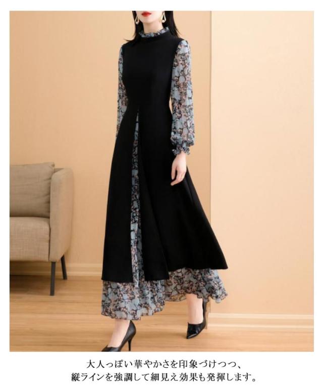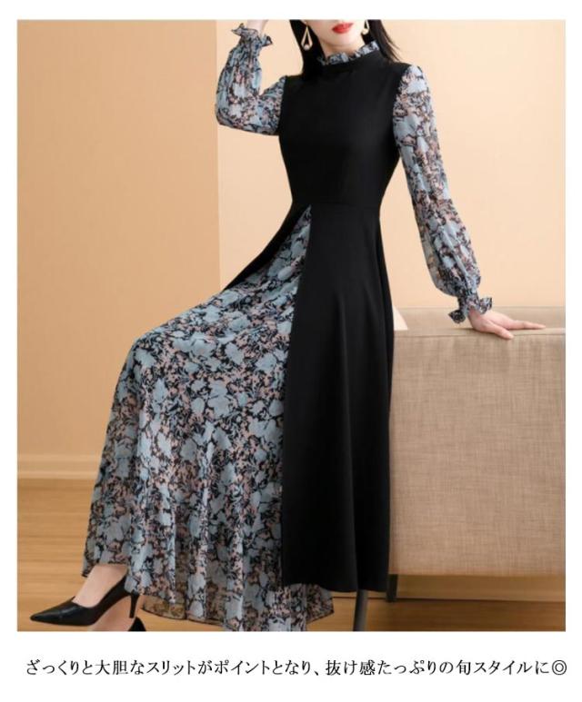 ワンピース レディース 長袖 フェイクレイヤード 異素材切り替え フレアワンピース フロントスリット シフォン 立ち襟 スタンドカラー 後ろファスナー Aライン 体型カバー ロング丈 細見え 大きいサイズ ゆったり 花柄