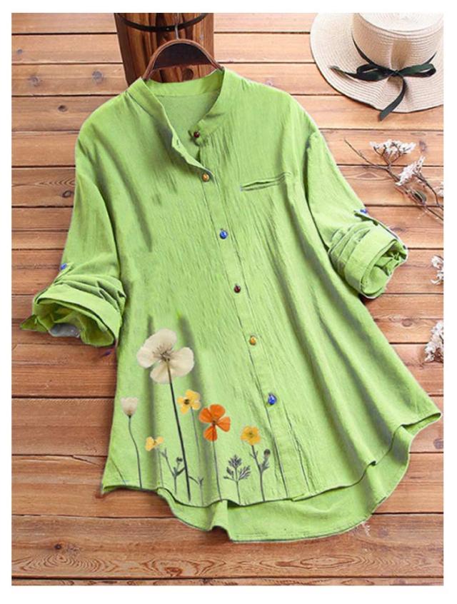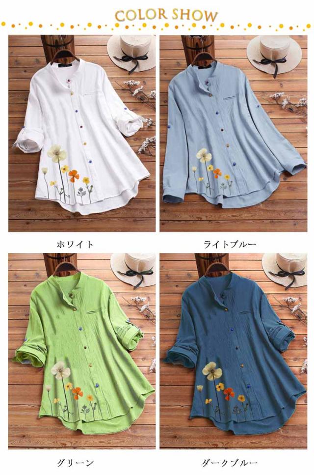チュニックシャツ スタンドカラー チュニック シャツ M-5XL ロングシャツ 前開き 花柄 ブラウス 長袖シャツ ゆったり Aライン 体型カバー 送料無料 カジュアル 通勤 OL オフィス きれいめ