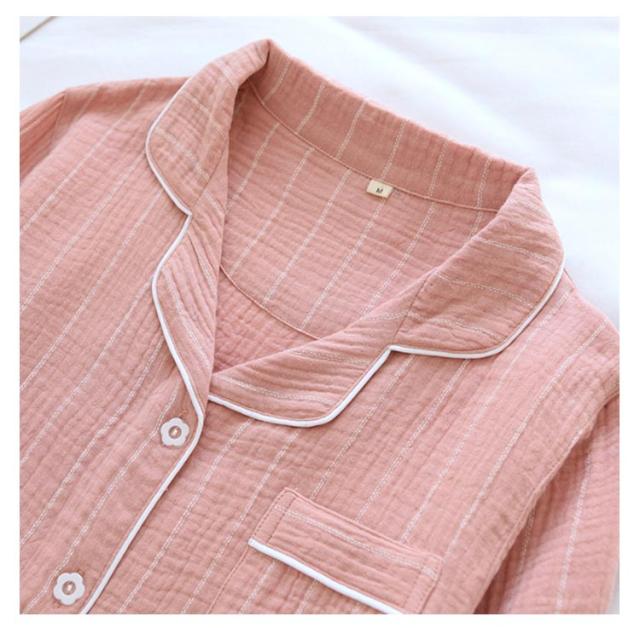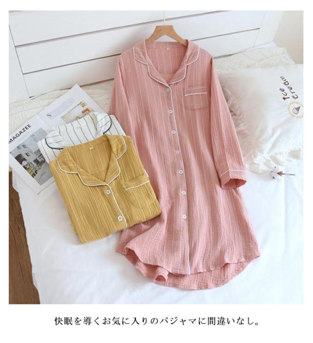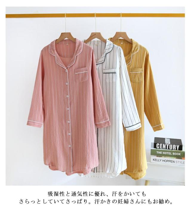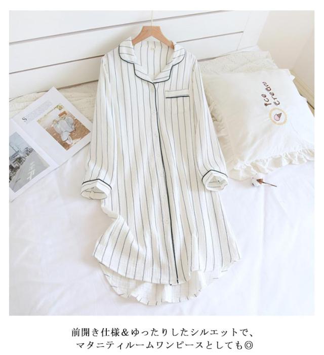 ワンピース 部屋着 2重ガーゼ 寝巻き 前開き マタニティ 長袖 ロングシャツ コットン パジャマ ネグリジェ 送料無料 Wガーゼ ストライプ柄 春・夏・秋・冬 授乳服 妊婦服 ルームウェア ナイトウェア ルームワンピース