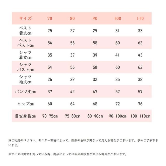 | サイズについての説明 | 【3点セット内容】長袖シャツ+ベスト+ロングパンツ 【サイズ】画像を参照お願い致します。 ※上記サイズは平置き実寸になります。 サイズ表の実寸法は商品によって1-3cm程度の誤差がある場合がございます。 |
