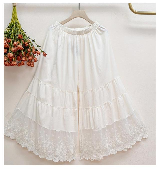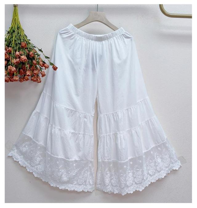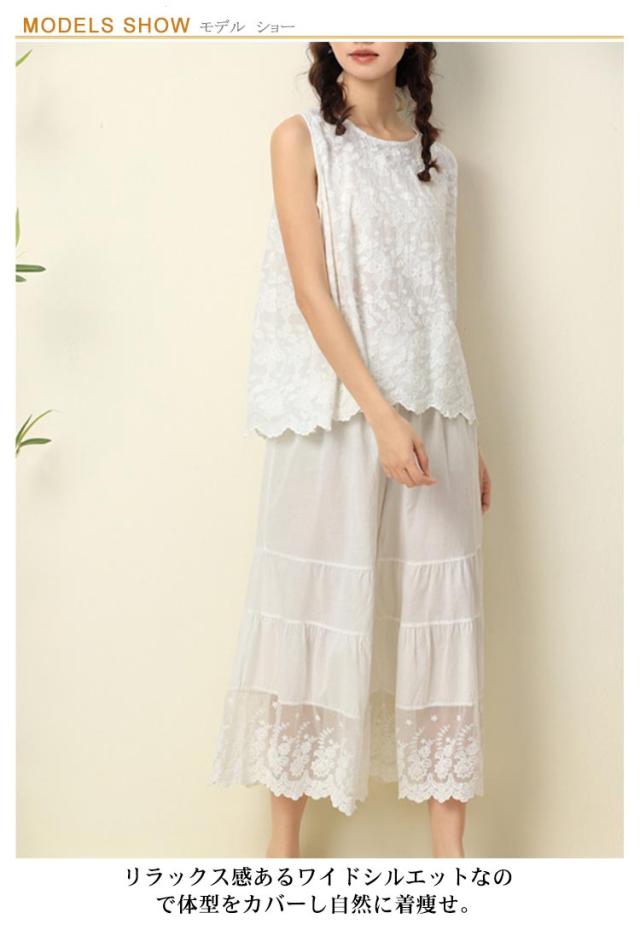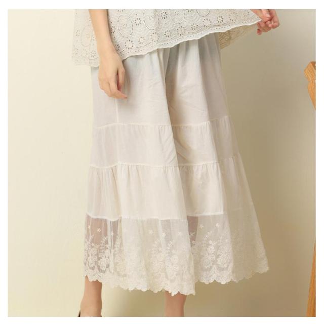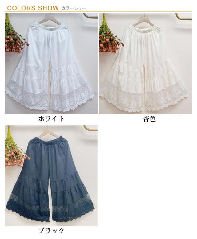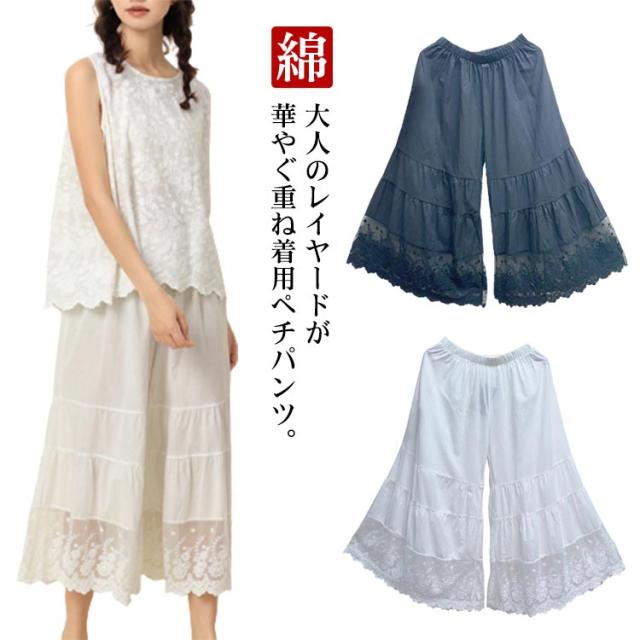ロング 裾レースパンツ ゴム ペチパンツ パンツ 綿 体型カバー 夏 レディース 送料無料 レース ズボン ペチコート ボトムス フレアパンツ ワイド 刺繍 黒 白 ベージュ 大きいサイズ 秋 冬 春 レイヤード