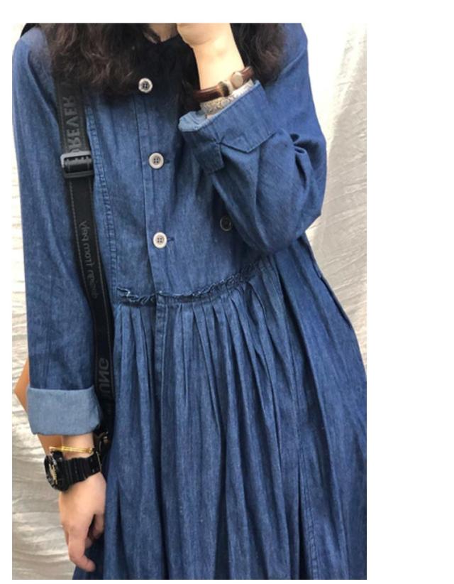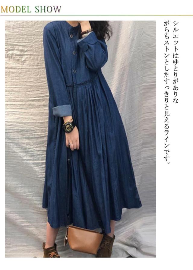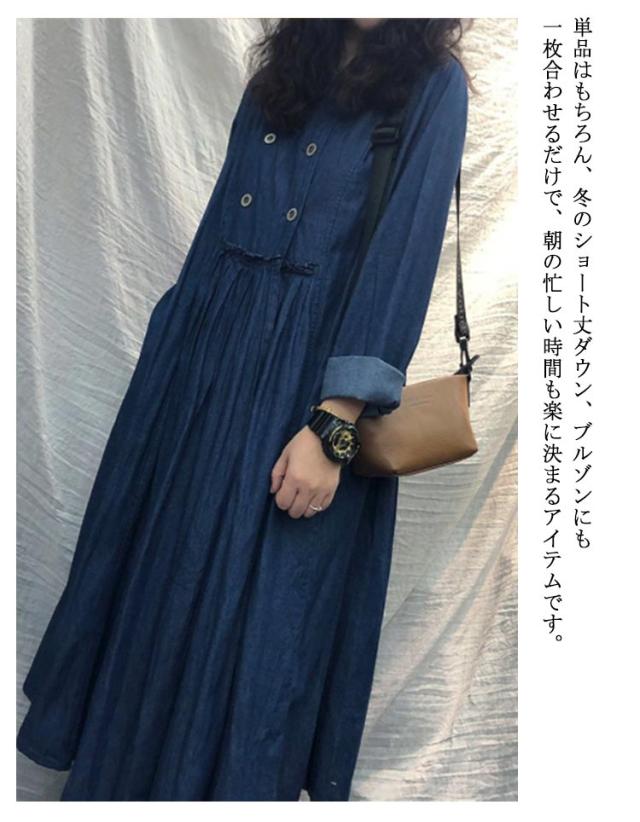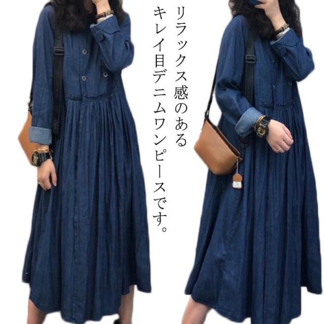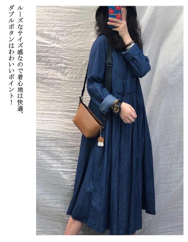カジュアル ロングワンピース 送料無料 デニムワンピ 長袖 デニムワンピース プリーツ レディース L 体型カバー 着痩せ 無地 ビッグシルエット レトロ XL ダブルボタン