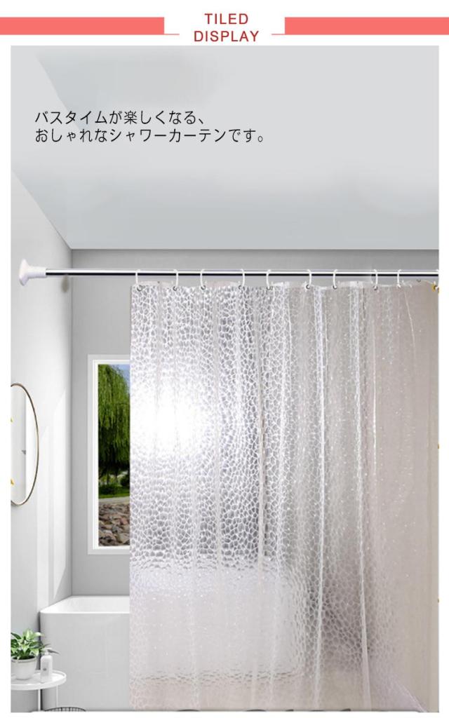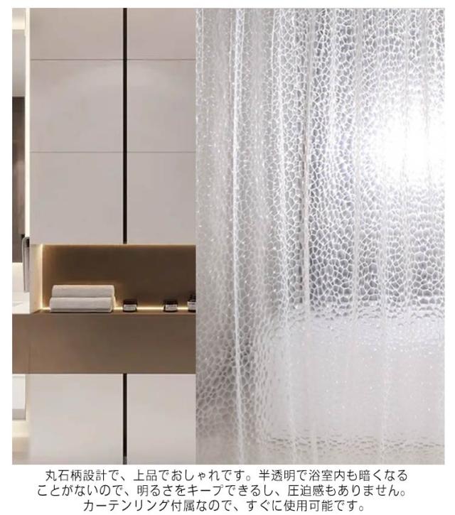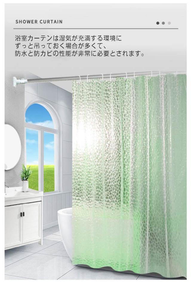 | バスタイムが楽しくなる、おしゃれなシャワーカーテンです。 【防水&防カビ】浴室カーテンは湿気が充満する環境にずっと吊っておく場合が多くて、防水と防カビの性能が非常に必要とされます。本カーテンは風呂場やトイレ専用の防水性と防カビ性を同時に持つシャワーカーテンです。洗っても洗ってもすぐにカビが生えてしまう悩みを解消し、衛生的で清潔感も持ち、毎日の面倒な手入れから解放されます。 【半透明設計】丸石柄設計で、上品でおしゃれです。半透明で浴室内も暗くなることがないので、明るさをキープできるし、圧迫感もありません。 カーテンリング付属なので、すぐに使用可能です。 【保温効果】シャワーカーテンを使用し、床に水が飛び散らないようにするとともに、バスルームの湿気を外に逃がさない保温効果があります。 | |