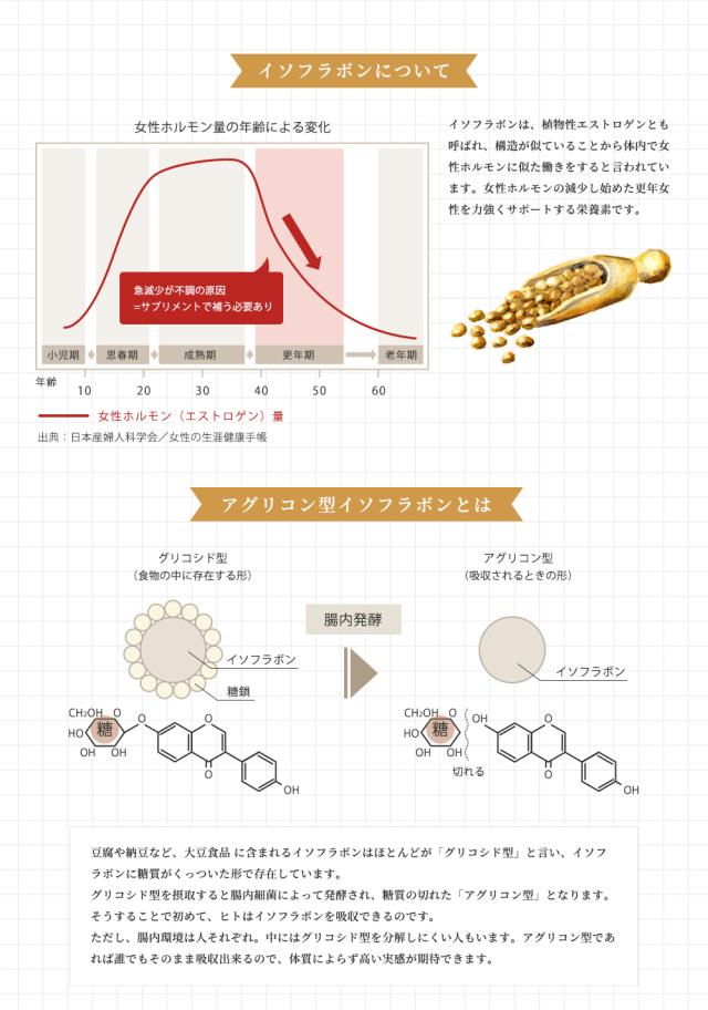 吸収効率の高いアグリコン型大豆イソフラボンを最大量の30mg濃縮配合したサプリメントです。