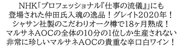 NHK「プロフェッショナル『仕事の流儀』」にも登場された仲田氏入魂の逸品!グレイト2020年!シャサン社製のこだわりオーク樽で18ヶ月熟成!マルサネAOCの全体の10分の1位しか生産されない非常に珍しいマルサネAOCの貴重な辛口白ワイン!
