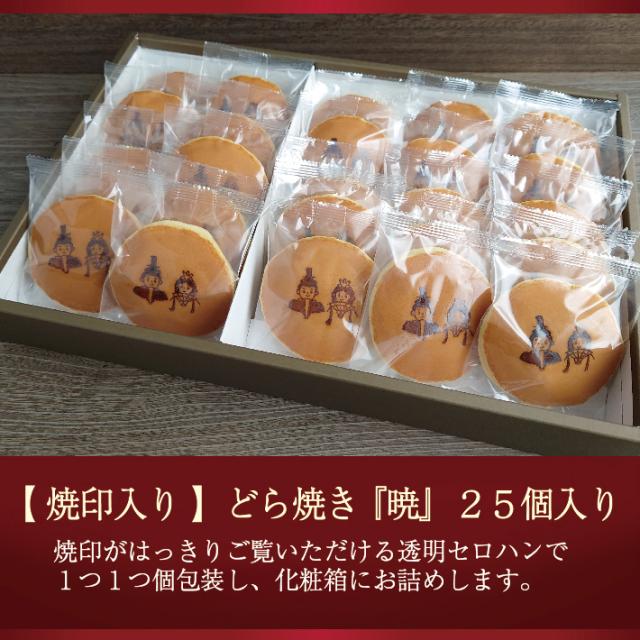 ひなまつり焼印入りどら焼き『暁』小倉あん25個入り 送料無料(北海道 沖縄除く) 老舗 ひな祭り 雛祭り 桃の節句 初節句 おひなさま お雛様 御祝 お祝い スイーツ お菓子 ギフト 贈り物 贈答 個包装 かわいい 祖父母 孫 女の子 子供 お返し 内祝い イベント 配布 景品 販促