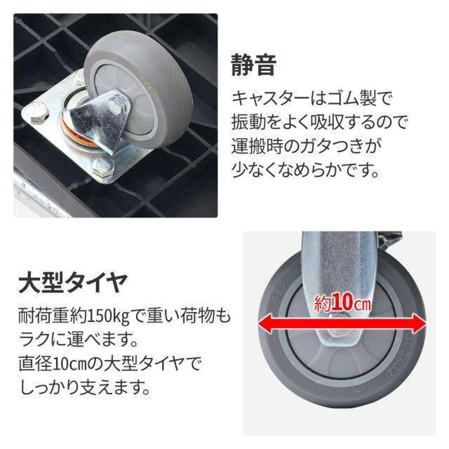 直径10cmの大型タイヤでしっかり支え、重い荷物もラクに運べます。(耐荷重150kg)