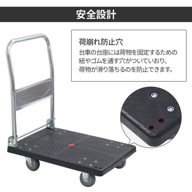 台車の台座には荷物を固定するための紐やゴムを通す穴がついています。