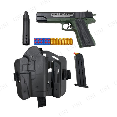 | セット内容 | ・本体×1 ・マガジン×1 ・サイレンサー×1 ・弾丸×20 ・薬莢×16 ・ガンホルダー×1 ※上記以外は付属しません |