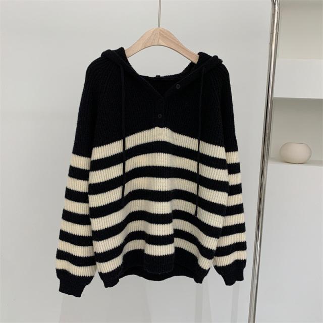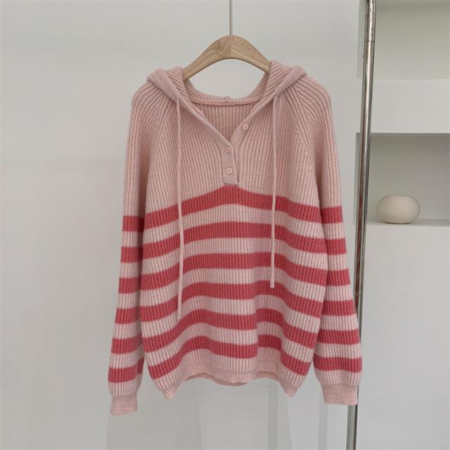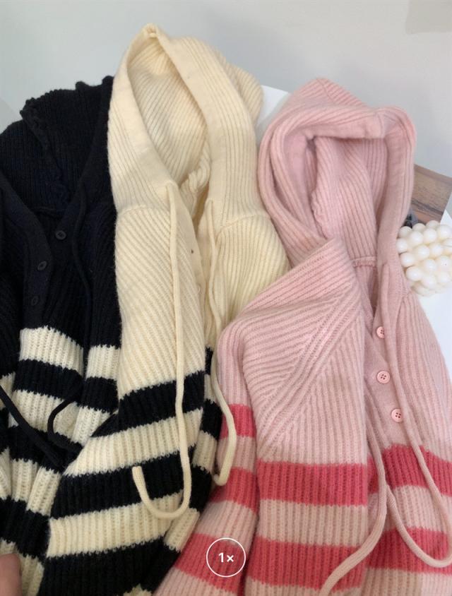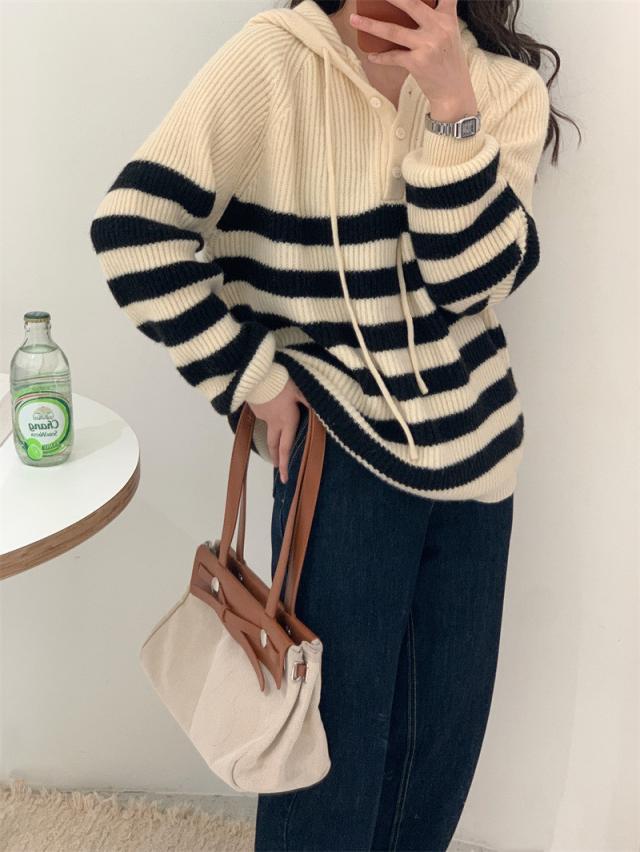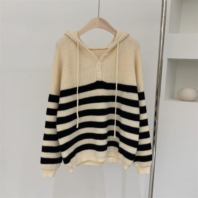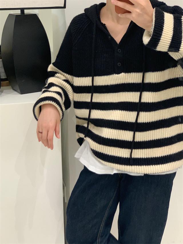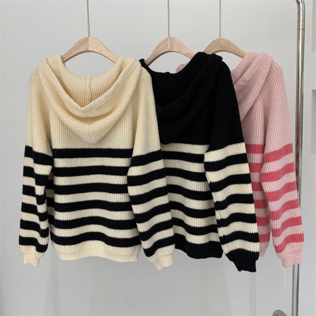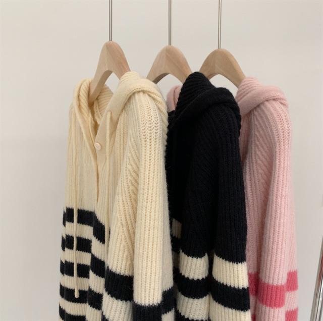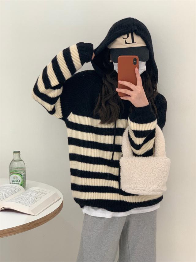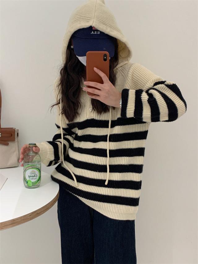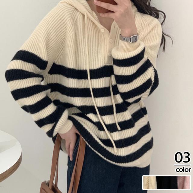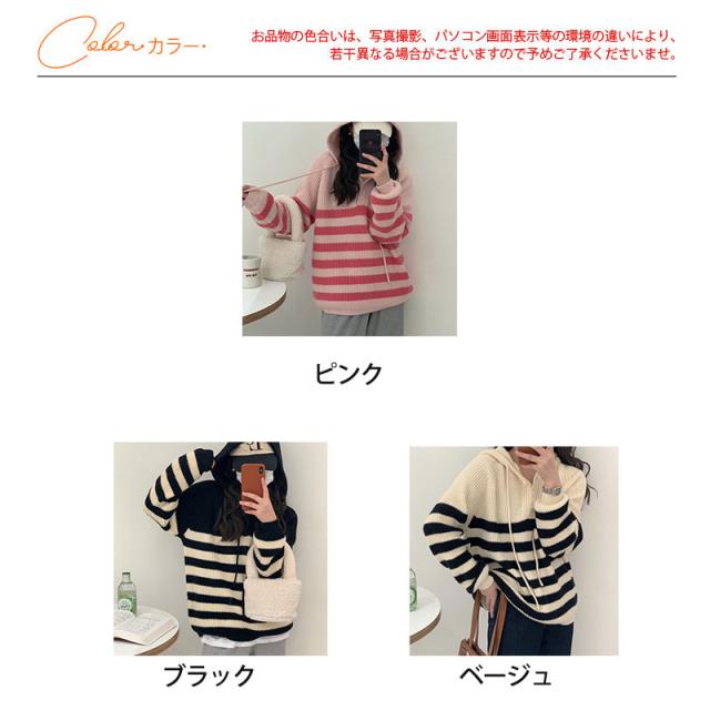 ニット レディース パーカー カットソー トップス フード付き 長袖 ストライプ柄 セーター カジュアル ゆったり おしゃれ 通勤
