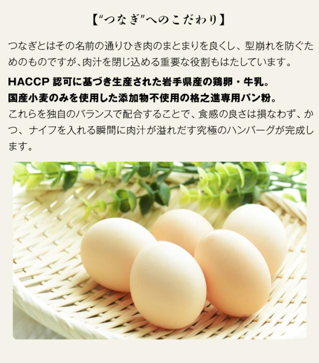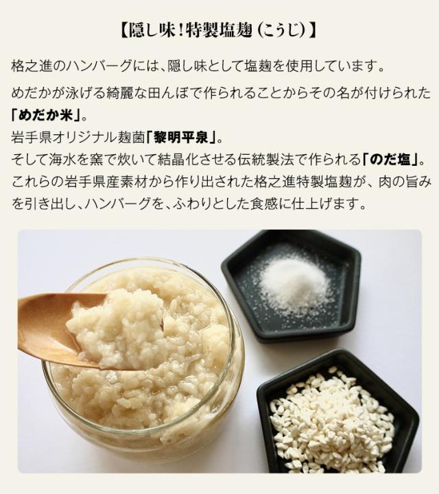 【原材料名】食肉(豚肉(国産)、牛肉(国産))、ソテードオニオン(玉葱)、つなぎ(鶏卵、パン粉(小麦を含む)、牛乳)、牛脂(国産)、塩麹(米、米麹、食塩)、食塩、香辛料、オニオンエキス
