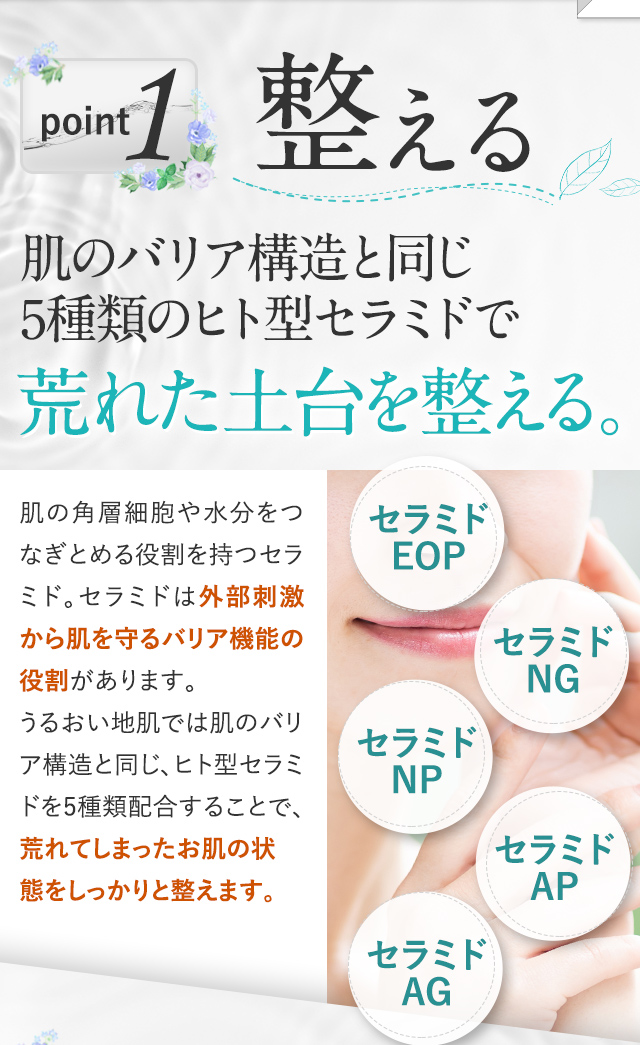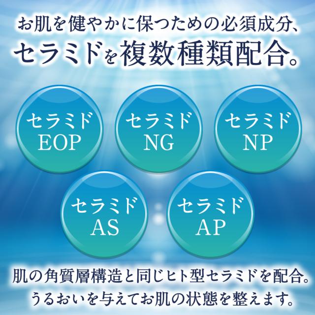 肌のバリア構造と同じヒト型セラミド配合(セラミドEOP、セラミドNG、セラミドNP、セラミドAS、セラミドAP)。うるおいを与えてお肌の状態を整えます。