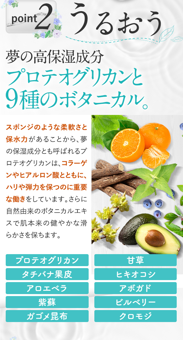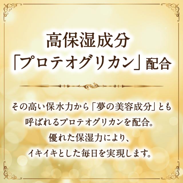 その高い保水力から「夢の美容成分」とも呼ばれるプロテオグリカンを配合。優れた保湿力により、イキイキとした毎日を実現します。