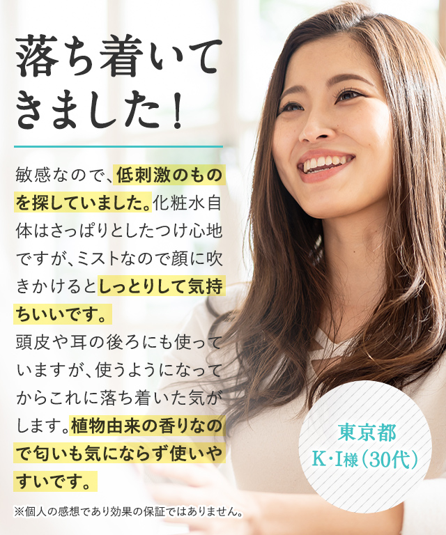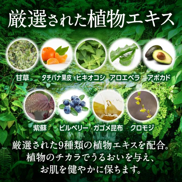厳選された9種類の植物エキスを配合。植物の力で潤いを与え、お肌を健やかに保ちます。