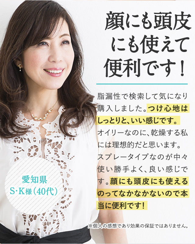 ※スプレータイプで顔、頭皮、耳の後ろなど全身にご使用頂けます。