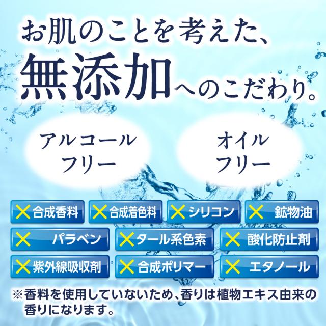 合成香料、合成着色料、シリコン、鉱物油、パラベン、タール系色素、酸化防止剤、紫外線吸収剤、合成ポリマー、エタノール 無添加
