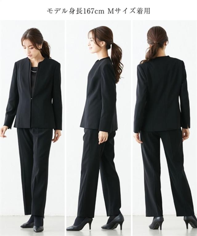 喪服 スーツ パンツ レディース 礼服 洗える防しわ北陸ジャガード使い ストレッチ ジャケット +パール調アクセ付 ブラウス + 有 黒 S/M/L ニッセン nissen