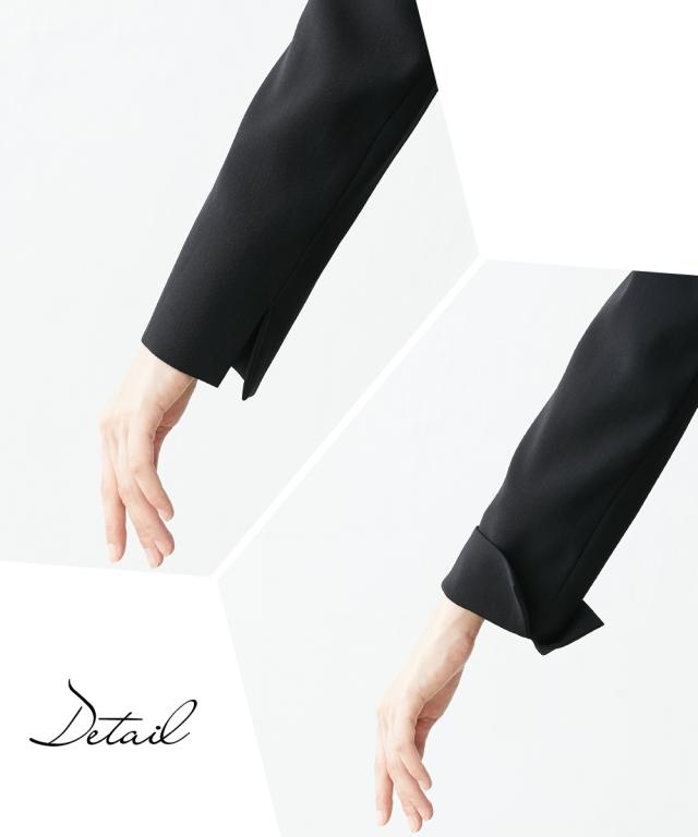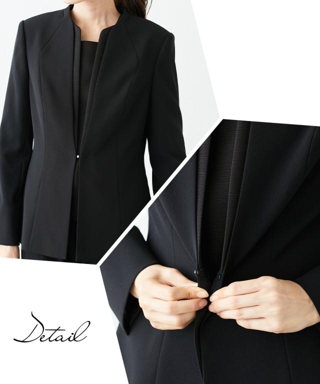 品のある格式高い装いを大切にする方へ礼節に沿った気品のある姿を叶えてくれる王道ブラックフォーマル こだわりポイント北陸ジャガード切替ブラウスで、上品な着こなしを演出してくれるストレッチパンツスーツ上品で格式高い装いの3点セットパンツスーツすっきりしたノーカラージャケットフロント部分に北陸ジャガード生地をを使用した上品なブラウスパール調アクセサリーで上品な雰囲気を演出スタイリッシュなパンツスタイルストレッチ素材を使用し、窮屈感を軽減前開き仕様ブラウスで着脱楽チン、お化粧崩れもカバーブラックフォーマル生地(漆