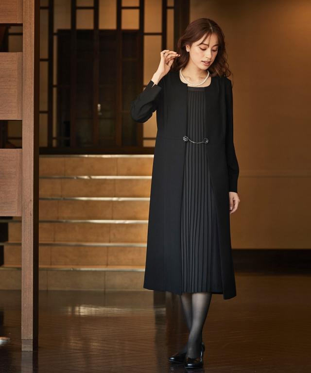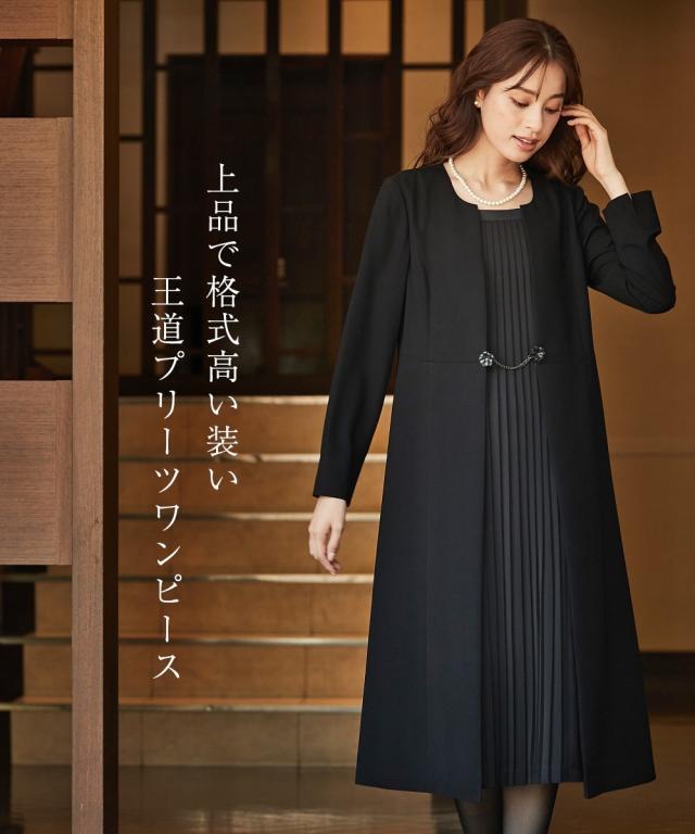 品のある格式高い装いを大切にする方へ礼節に沿った気品のある姿を叶えてくれる王道ブラックフォーマル こだわりポイント美しさ・着用しやすいさ・体型カバーを叶えるこだわりのワンピースフロントプリーツ仕様で、上品な雰囲気を演出フロントホックでさりげなくプリーツを見せるスタイルにドレスレットでフロント部分を華やかに前開き仕様で、着脱楽ちん・お化粧崩れもカバー授乳中の方にもおすすめですブラックフォーマル生地(漆黒)を使用、きちんと感のある装いに防しわなので、しわになりにくい手洗いできるので、お手入れ楽チン喪服としてだ