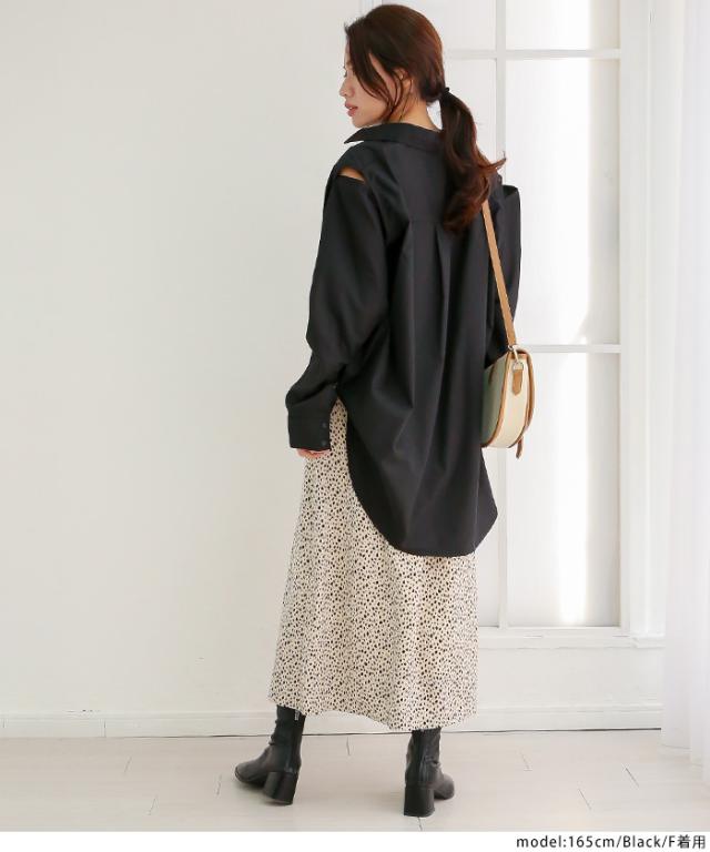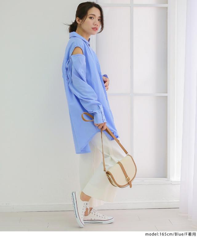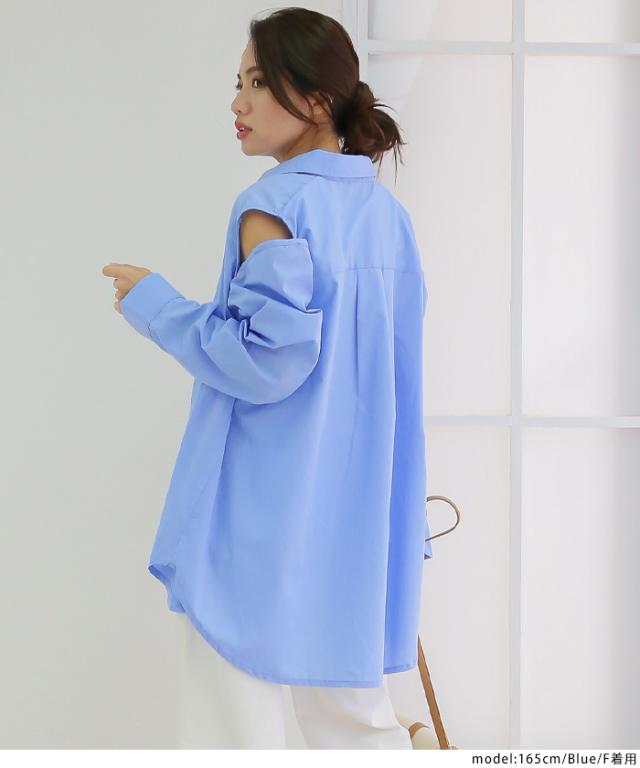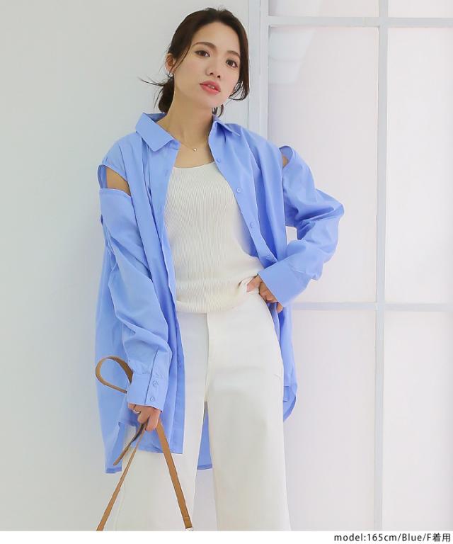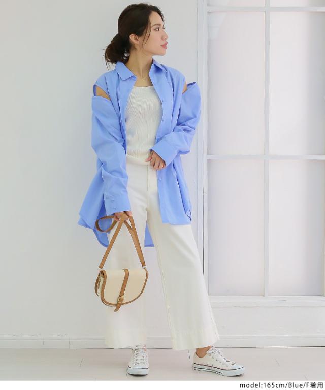 今シーズントレンドの抜け感のある肩あきブラウス。肩部分にスリットを入れ、ヘルシーに肌見せできます。ゆったりとしたシルエットとややハリ感のある素材で、レイヤードや羽織としても活躍。ボタンを留めるとベーシックなシャツスタイルとして着回せ、デイリーに活躍してくれるアイテムです。