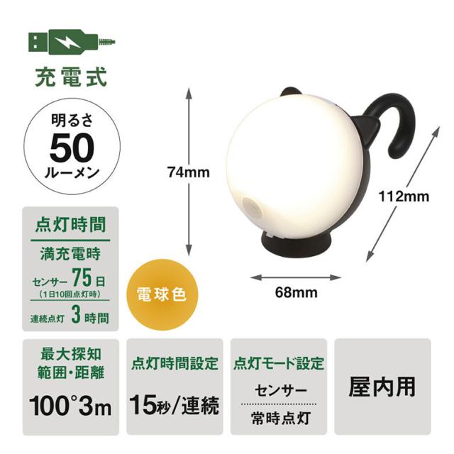 【36%引き】 人感センサーライト 防犯ライト ランタン ムサシ 充電式 まんまるねこちゃんセンサーライト(WAM-051BK/WAM-052GR/WAM-053AC) 6ヶ月保証付 非常灯 フットライト 寝室 間接照明 led 防犯グッズ 人感センサー ライト 玄関 階段 室内照明 猫 ネコ