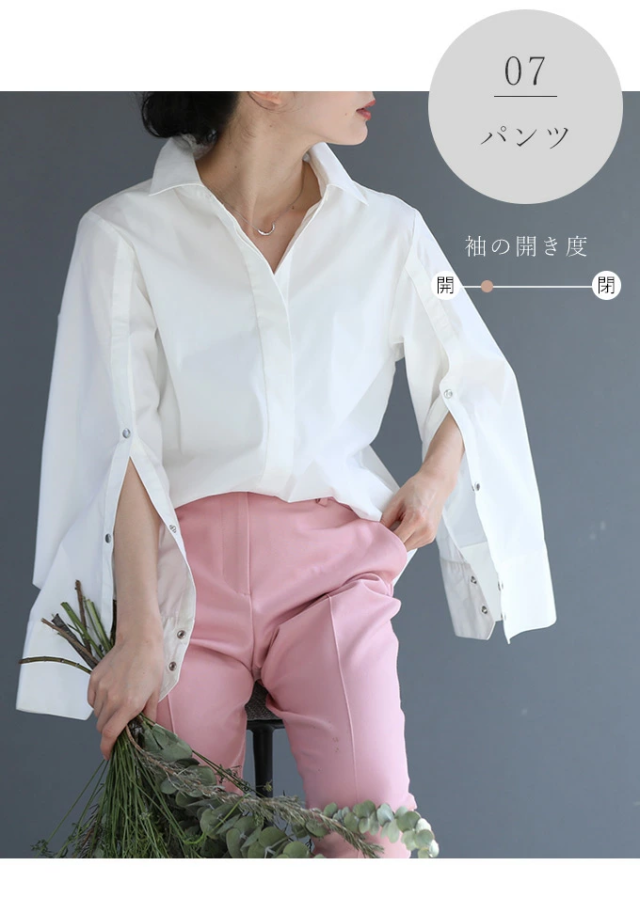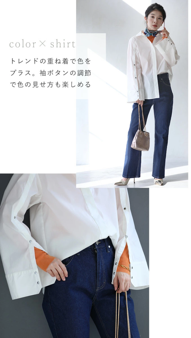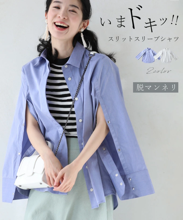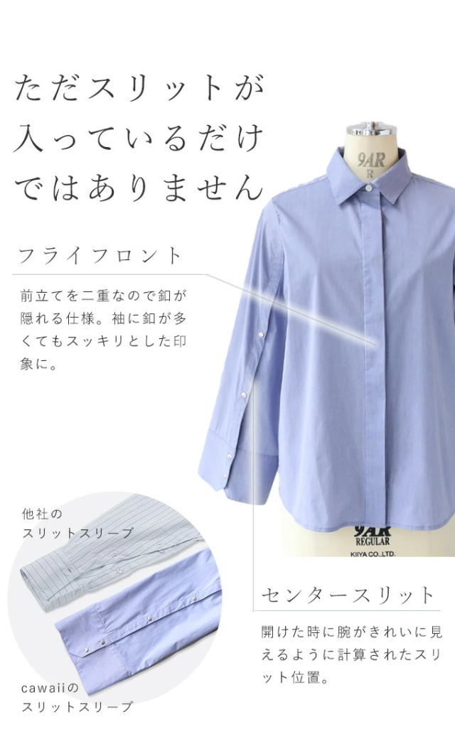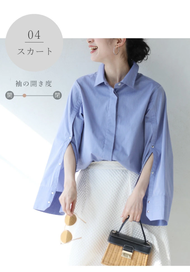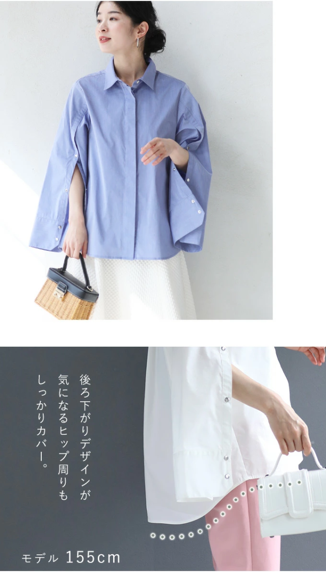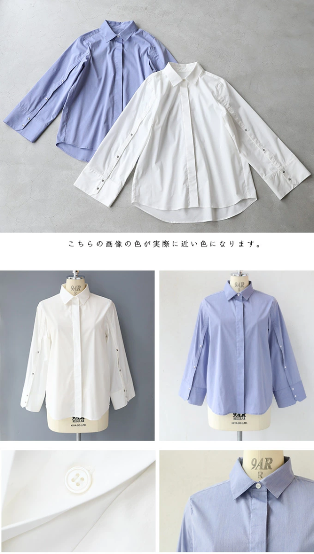 【閉店SALE】 (S~2L対応)いまドキッ!! スリットスリーブシャツ fzp00077od cawaii トップス レディース シャツ ブラウス 長袖 白 白色 ブルー 青 水色 カジュアル きれいめ オフィス ロング丈 無地 ゆったり 冷房対策 紫外線対策 春夏 体型カバー お尻 春 夏