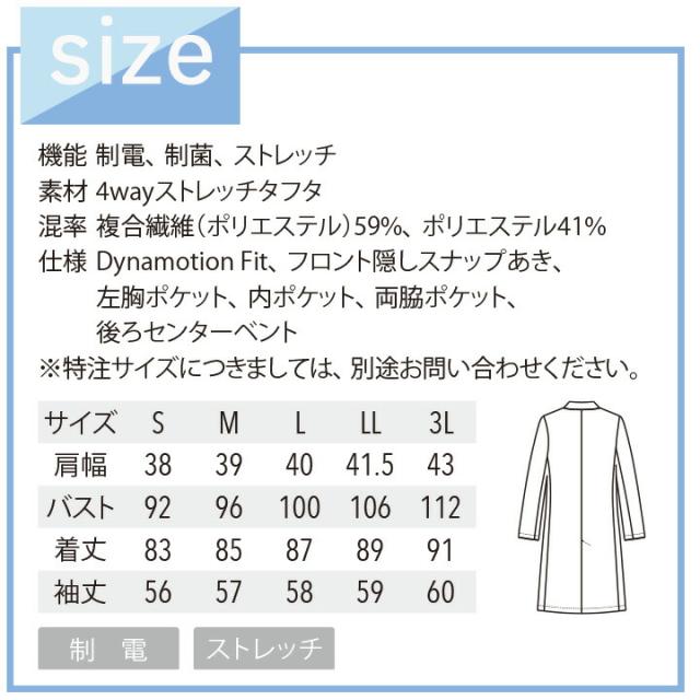 ■機能:制菌、制電、ストレッチ<br>S:肩幅 38cm/バスト 92cm/着丈 83cm/そで丈 56cm