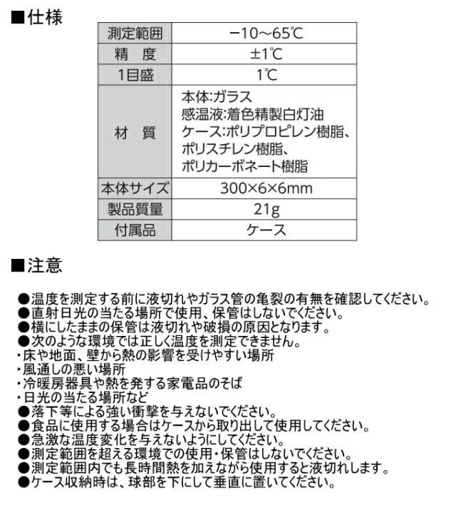 棒状温度計 ケース付 H-7C 30cm -10〜65℃ 73215 温度 温度測定 気温 水温 地温 測定 シンプル ケース付