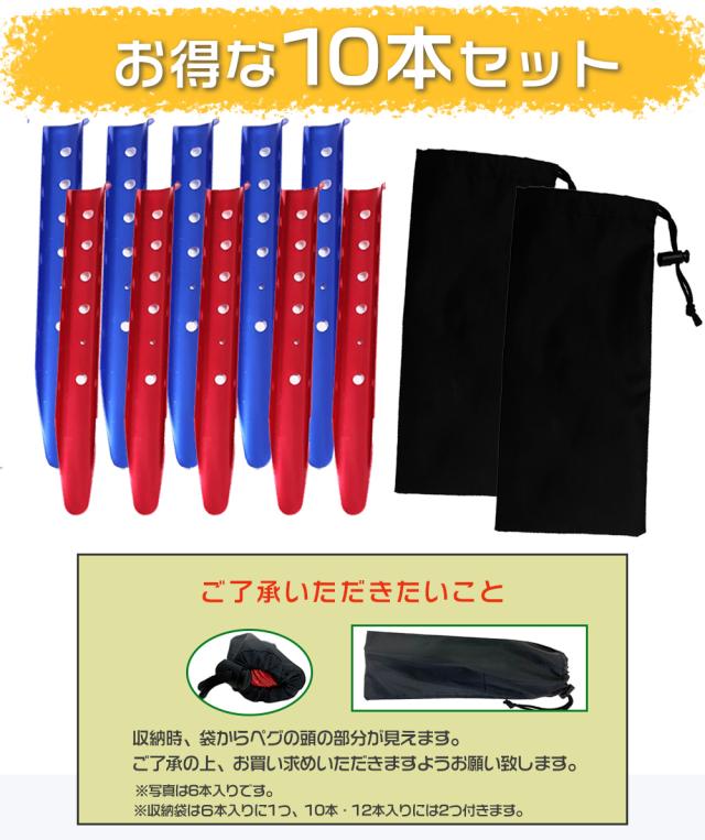 ペグ 10本セット サンドペグ スノーペグ U字型ペグ 31cm 黄 赤 青 白 黒 U型 テントネイル ビーチ 砂浜 雪 キャンプ用 軽量 携帯 アウトドア 野外 携帯に便利 収納袋付き