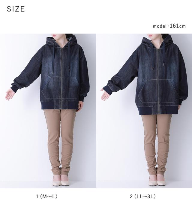 | staff:C/158cm B87 W70 H92.5 【普段着用】 トップス: M ボトムス: M | 【1(M〜L)】 ◆袖丈:手の甲にかかる位 ◆着丈:ヒップが隠れる位 【2(LL〜3L)】 ◆袖丈:指の真ん中位 ◆着丈:太ももにかかる位 1(M〜L)はインナーに薄手のニットが着れるほど、程よくゆとりをもって着られました。デニムなのに軽くて楽な着心地でした。フードがしっかり立って可愛いです♪2(LL〜3L)は全体的によりゆったりとしていました。私の場合は、十分にゆとりがあったので1(M〜L)を選びますが、オーバーサイズで着たい方には2(LL〜3L)がお勧めです。 |