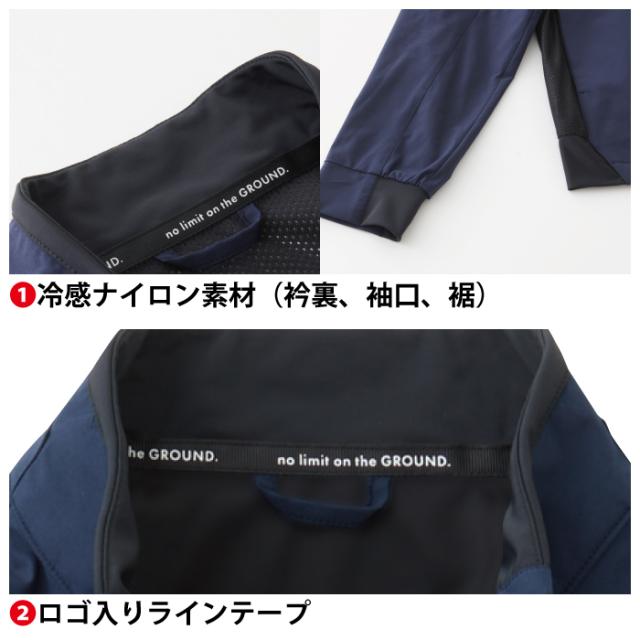 ◇冷感ナイロン素材(衿裏・袖口・裾)・ロゴ入りラインテープ・胸ファスナーポケット(野帳が入る)・空気穴・反射ロゴプリント・袖ペン差し・メッシュ素材・デオドラントテープ