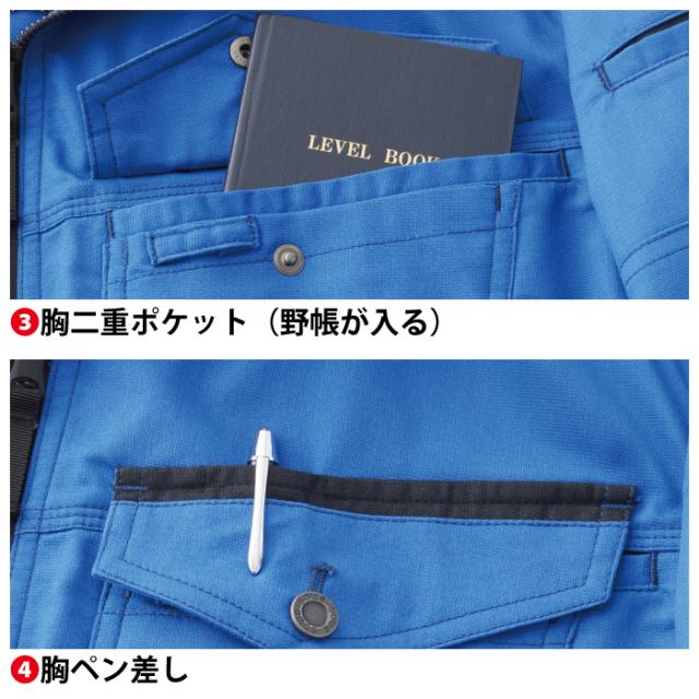 ◇背裏メッシュ・ファスナーポケット・胸二重ポケット(野帳が入る)・胸ペン差し・袖ペン差し・ネームループ(隠し)・脇ポケット・袖口ドットボタン