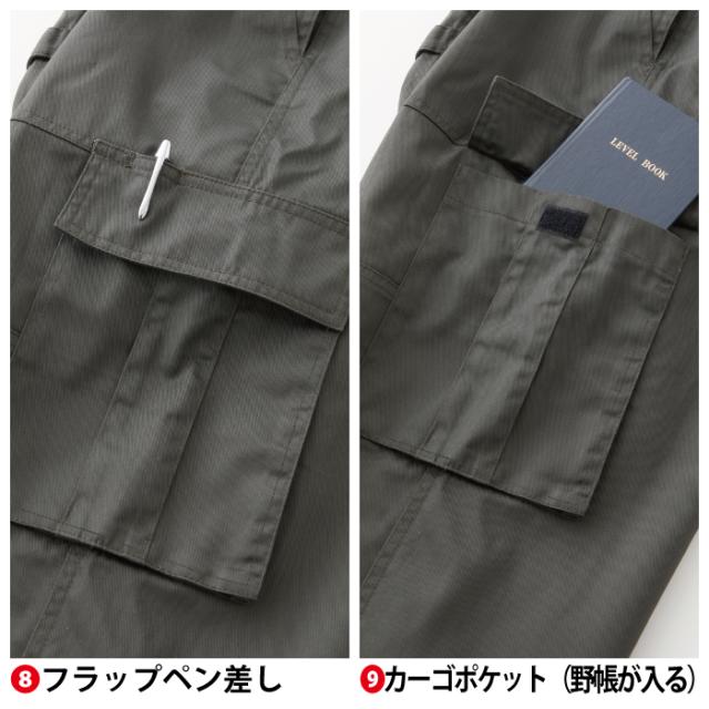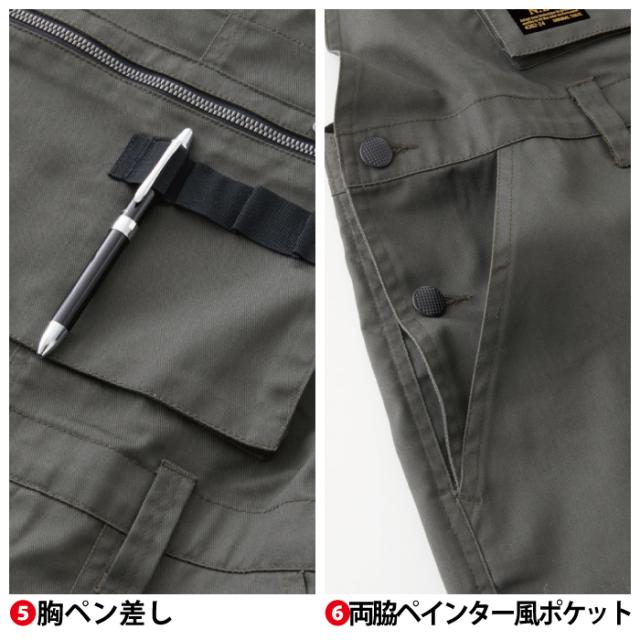 ◇ナイロンベルトサスペンダー・胸ファスナーポケット・胸ペン差し・両脇ペインター風ポケット・ハンマーループ・フラップペン差し・カーゴポケット・裾ファスナーポケット・裾リブ