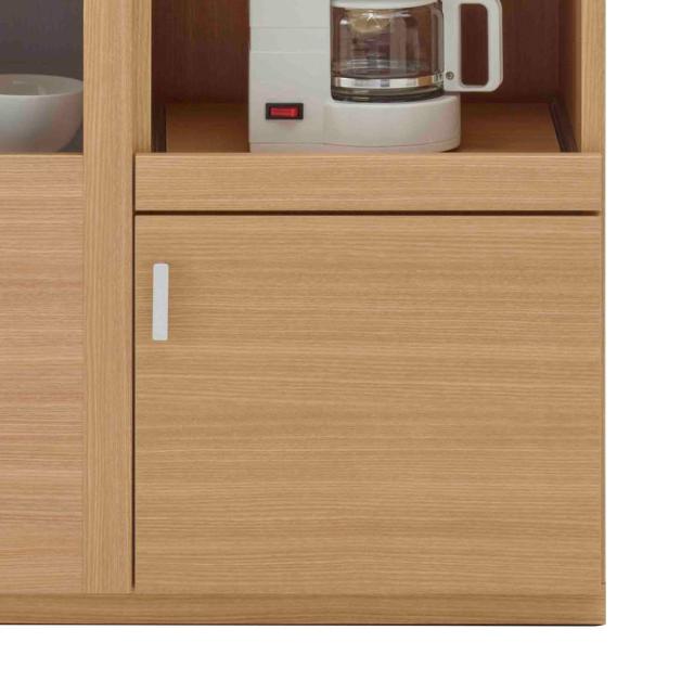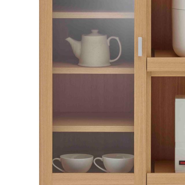 向かって左側にはガラス扉収納付きです。良く使うものやお気に入りの食器、小物などの収納におすすめです。上から2段目の棚板以外は、可動棚なので収納物に合わせてお好みで高さを調整していただけます。