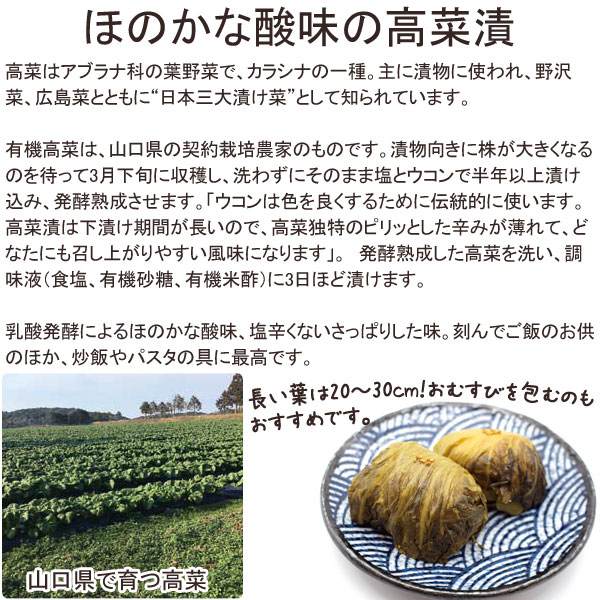 有機たかな漬は、2年以上化学肥料や農薬を使用していない畑で栽培された山口県産の高菜を原料としています。塩やうこんで半年以上漬込み、発酵熟成させ出来上がります。