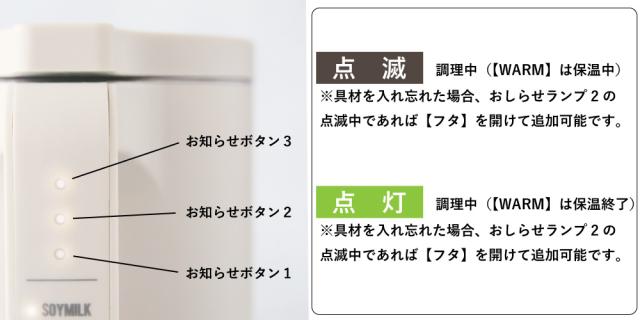 調理が終了したら、ピーッと音が鳴ります。【電源コード】を抜き、【フタ】を回して開け、器に注いでください。 | お知らせランプの見方