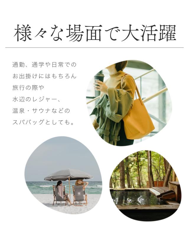 通勤、通学や日常でのお出掛けにはもちろん、アウトドア・レジャーや旅行、温泉やサウナ用のスパバッグとしても使えて様々なシーンで活躍します。