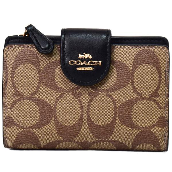 コーチ 財布 COACH コーティングキャンバス スムースレザー シグネチャー ミディアム コーナー ジップ ウォレット 二つ折り財布 カーキ×ブラック C0082
