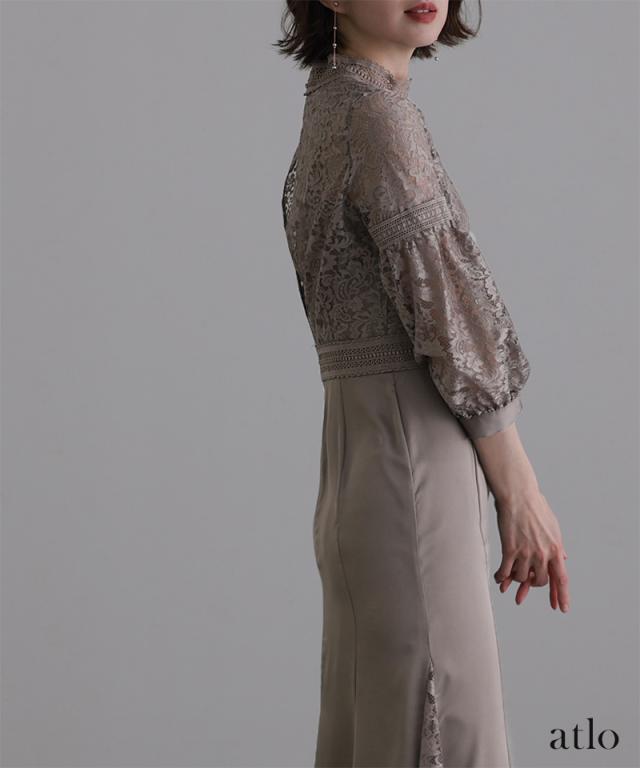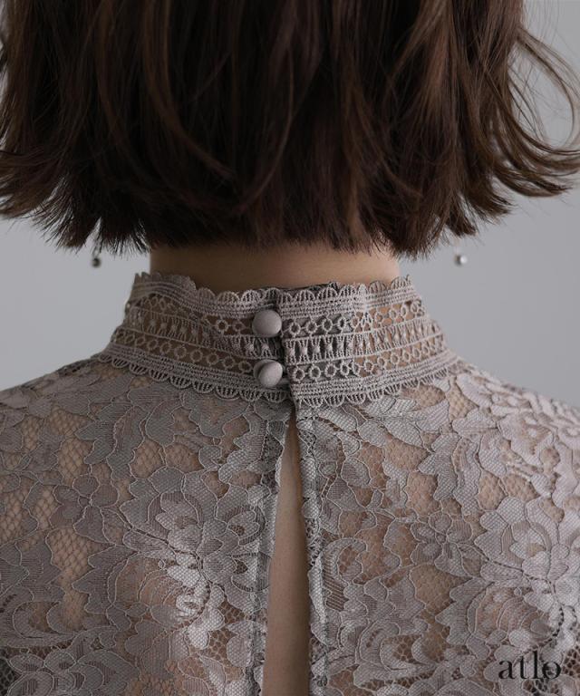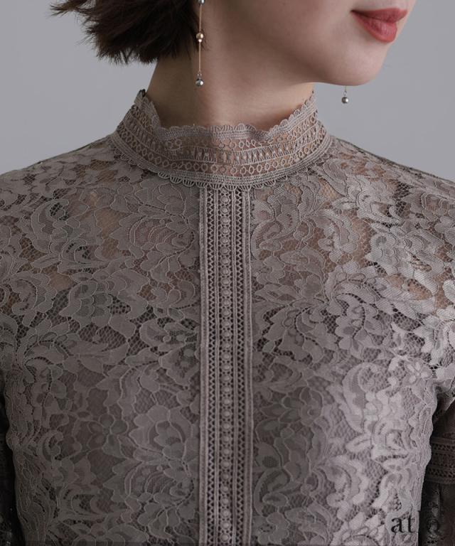 透け感あるレースのハイネックが優雅なイメージを与えてくれます。