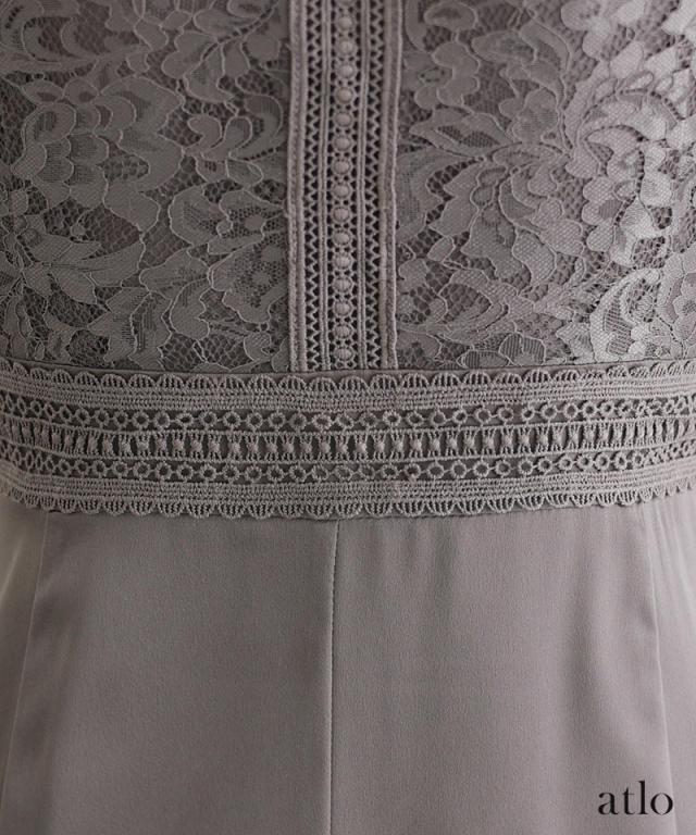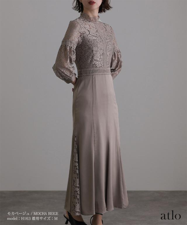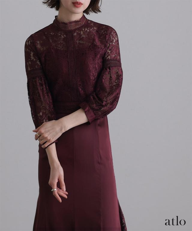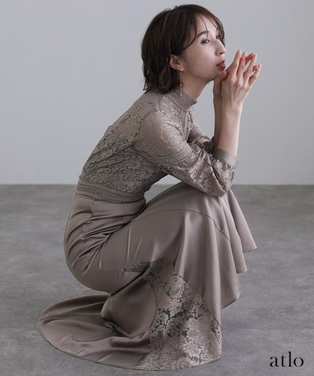 レースとサテンの切り替えデザインが上品なワンピース。