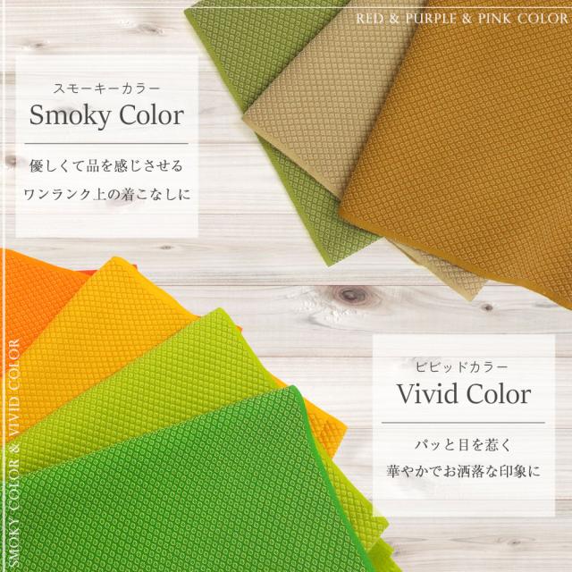 華やかなお着物にピッタリのビビッドカラーや流行のスモーキーカラーまで『黄・緑・オレンジ』カラーの10色をご用意しました。