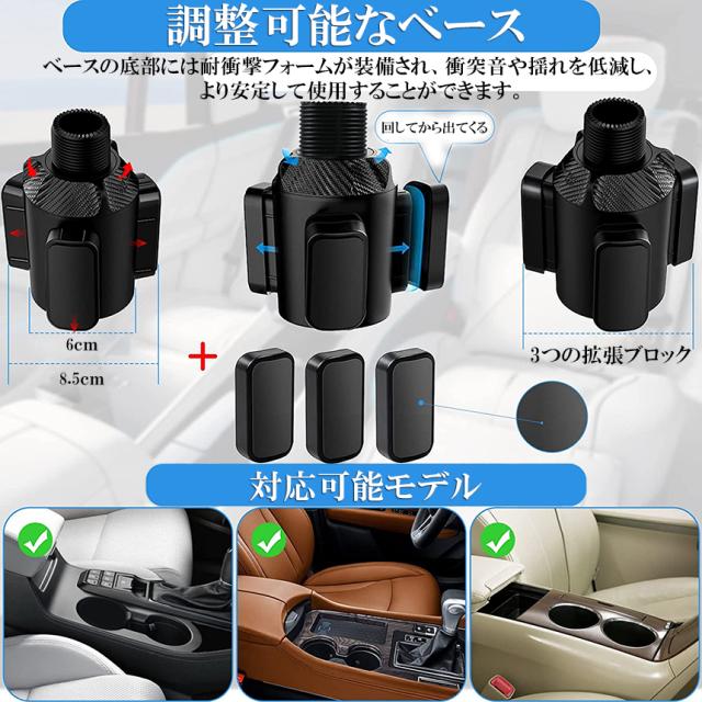 ●ドリンクホルダー部分に本体を差し込み、矢印方向に回すだけで簡単に設置完了!固定部分は滑り止め加工が施されており、がっちりと固定できます。未使用時は取り外しアーム部分を取り外すことでコンパクトに収納いただけます。